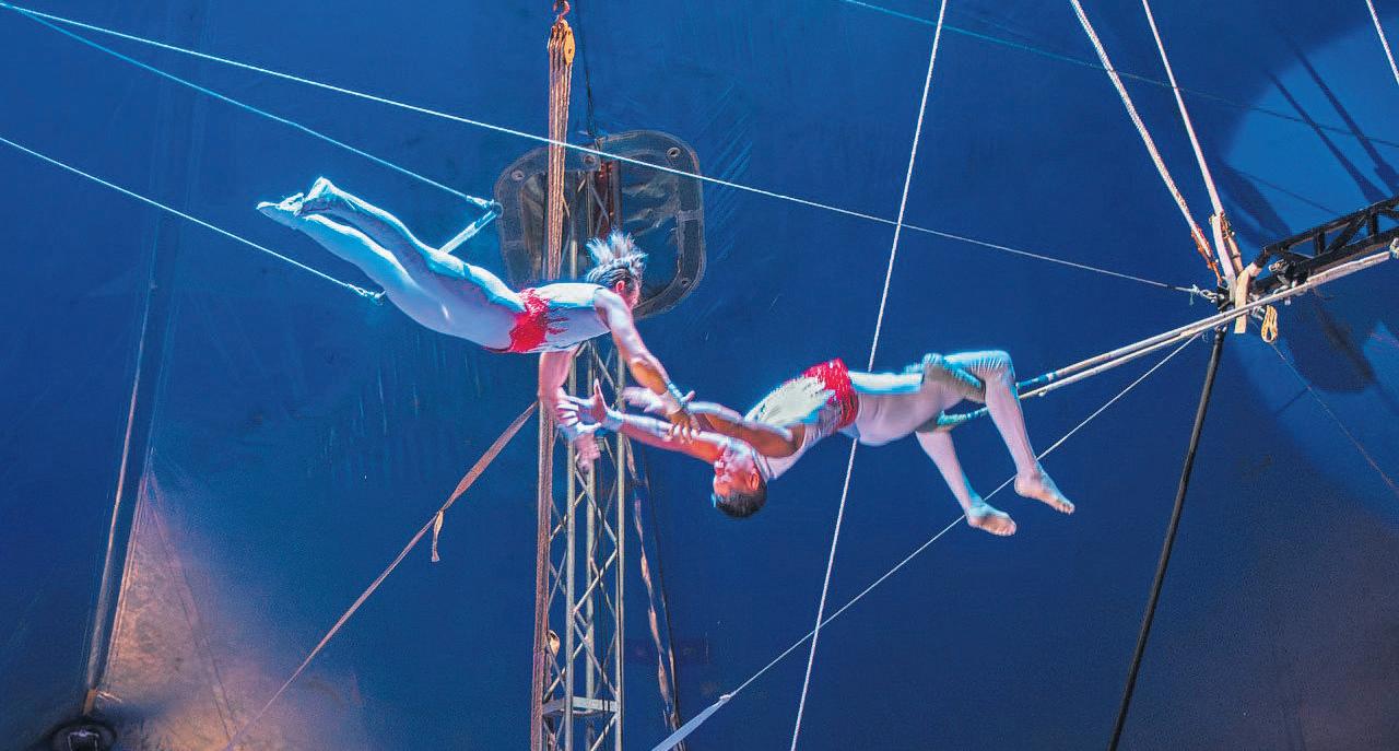 Forthe firsttime in 26 years, afull FlyingTrapeze will travel the country, takingaudiences high into the airwith breathtakingaerialskill, strength,and daring. Addingtothe excitement is thelongawaited return of the Globeof Death, one of the mostrequestedacts by circusfans,featuring heartpoundingmotorcyclestuntsperformed at incredible speedinside asteel sphere.
