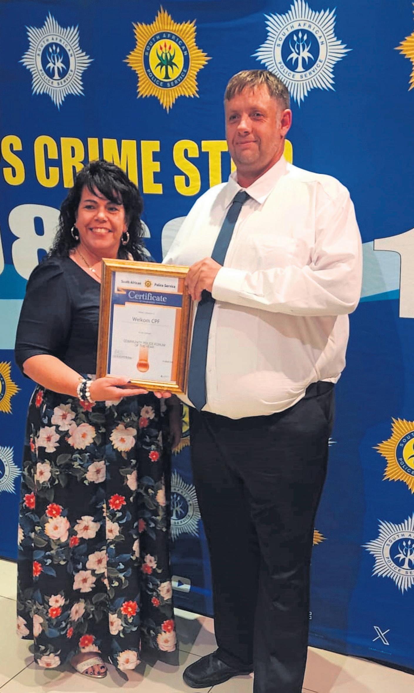 Welkom cantrulybeproud – not onlydid the Welkom Police Station come second overall in thecategoryPoliceStation of theYearduring theProvincial ExcellenceAwards2024-’25,butthe Welkom Community Policing Forum came thirdinthe category best CPF. Theawardswere heldatthe WoodlandsCountryLodge in Paryson14January.“Congratulations to Brig.Disebo Cezula and the entireWelkom SAPS team on this outstanding achievement,and also Dirk Kotze,chairman of theCPF and theWelkom CPFonyour outstanding achievements,”saysElizabeth Nunes,publicityrelations officerfor theWelkom CPF. Nunes says these achievements reflect thededication,commitment and hardworkofall involved in serving thecommunity.Here areNunesand Kotzewith theaward received PHOTO:Supplied