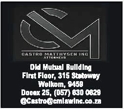 Esta te Nu mb er: 9017/2025 Identity Number: 390130 006308 4 Da te of De ath : 12/11/2025 Last Address: 6 SPRINGBOKAVENUE, VENTERSBURG, FREE STATE, All persons having claims against the above-mentionedestate are required to lodgetheir claims with the undersigned within 30 days after the date of publicationhereof.
