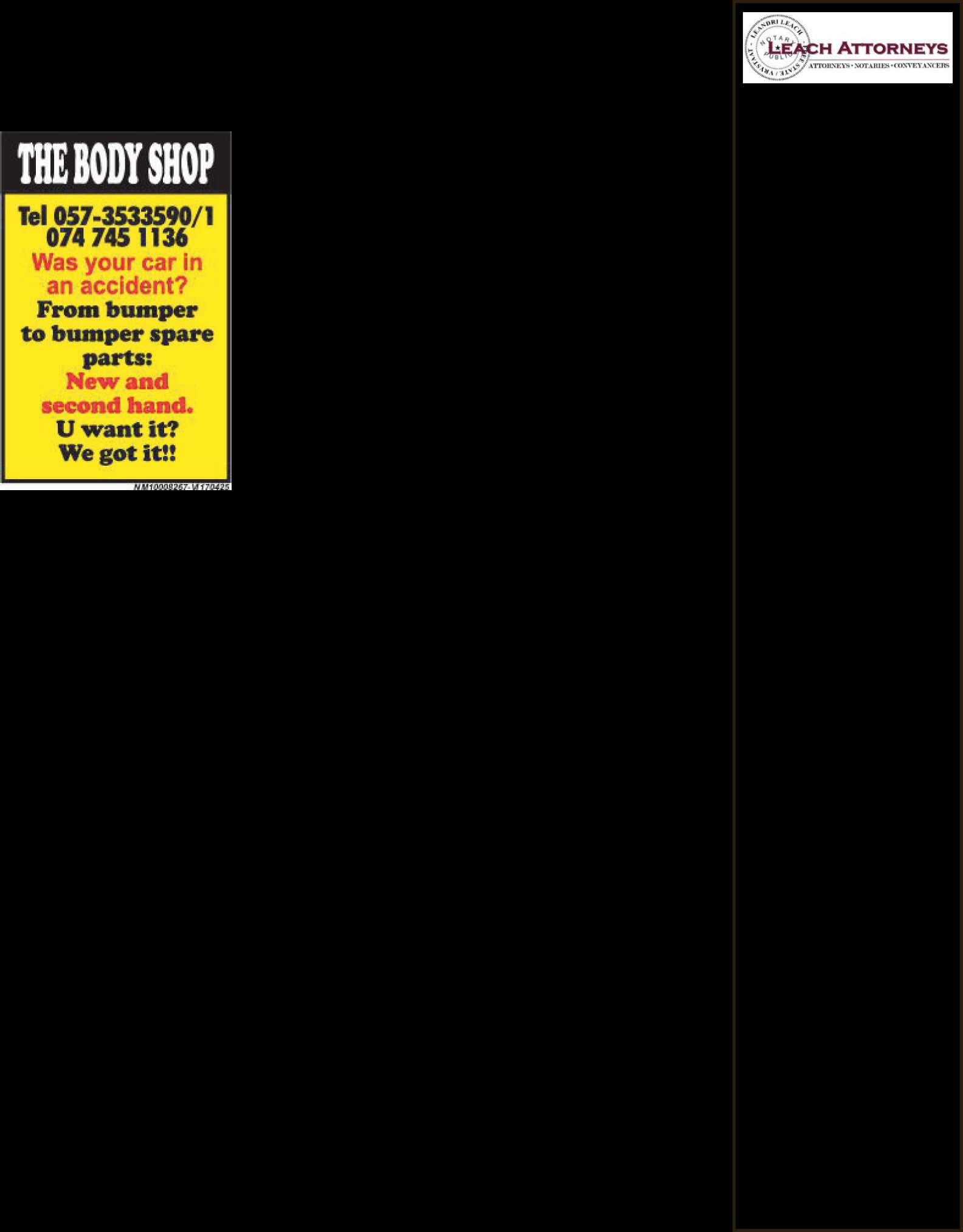 Advertiser Name: BA DE NHO RS T ATTORNEYS 40 STEYN STREET, HENNENMAN, 9445 Advertiser Email: baden hors t @badenhorstprok.co.za Advertiser Telephone: 057-5731114