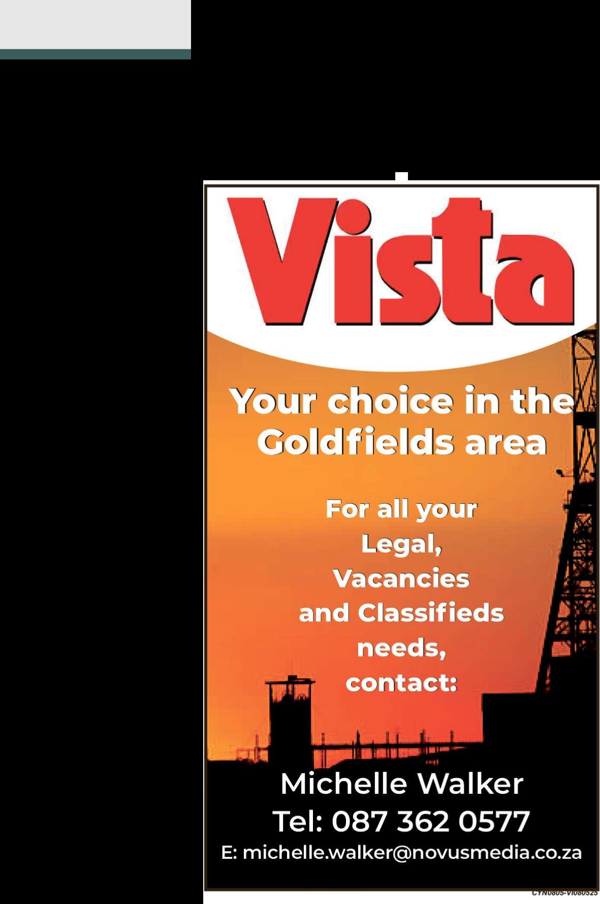 Theweekly parkrun starts at 08:00 at the St Dominic's College sports fieldat85Jan Hofmeyr Road. Walk, jog,run or volunteer Access viathe Volks Road entrance. Kontak Vista metinskrywingsoor konserte, optredes vankunstenaars en gassprekers en andergeleenthede tenbatevan niewinsgewende organisasies Dit word gratisindie dagboekgeplaas. Stuur inligting, asook kontakname en -nommers, na marti.will@ novusmedia.co.za.