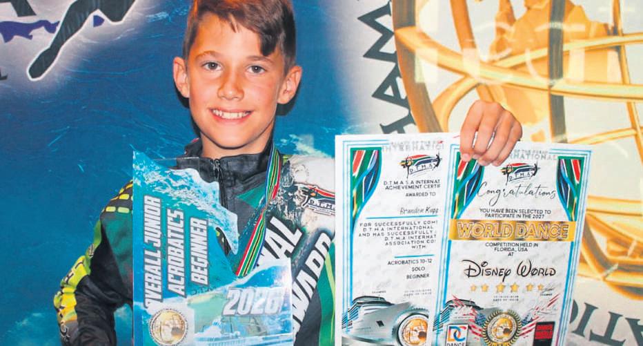 Brandon Kapp (13),‘ngraad 7-leerder by Voluit Primêre Skool in Virginia,het eersteplekbehaal in akrobatiesedans tydens‘n internasionalekompetisie aan boordvan dieMSC Operakruiseskip.Die jong danser,wat sedert een jaar en vier maande by Amanda’sSchool of Danceoefen,het van16tot 20 Maart saam met die EliteSquad op die skipopgetree.Hyhet ‘n gemiddeldvan 93,8%vir akrobatiese dansbehaal en die algeheleprysvir hierdie kategorie verwerf.Hyhet ook spesiale erkenning ontvang as‘n“exceptionallygifted youngman”en sy internasionalekleureverwerf.Hyisnou eenvan 25 danserswat Suid-Afrikavolgende jaar in Junie by DisneyWorldinFlorida,