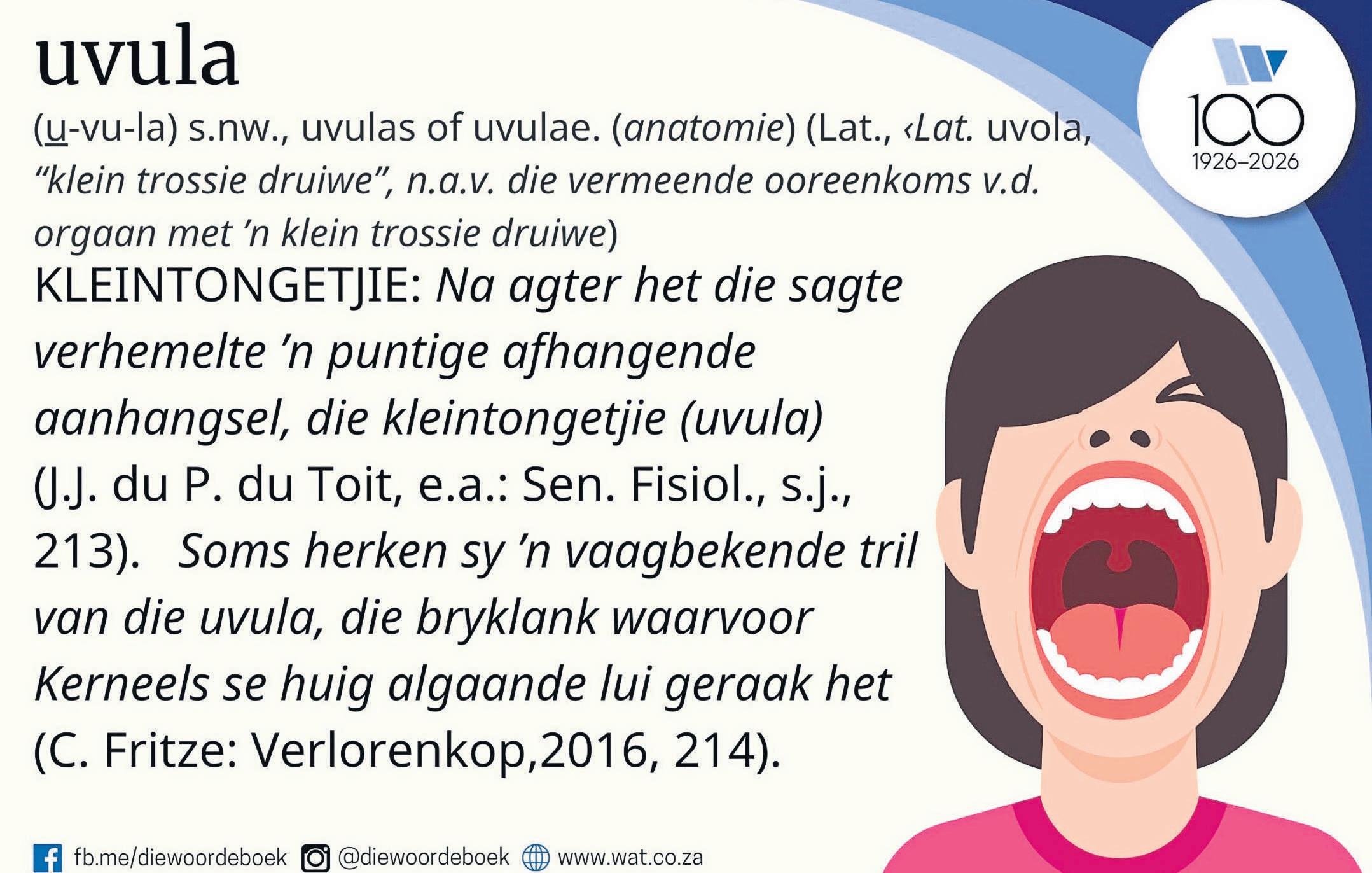 Die Woordeboek vandie AfrikaanseTaal (WAT)seWoordvan die Week is uvula(u-vu-la) s.nw.,uvulas of uvulae -kleintongetjie:Naagter het die sagteverhemelte ’n puntigeafhangendeaanhangsel,diekleintongetjie (uvula) (J.J.duP.duToit,e.a.: Sen.Fisiol.,s.j.,213).Soms herken sy ’n vaagbekende tril vandie uvula, die bryklank waarvoor Kerneels se huig algaandelui geraak het (C.Fritze: Verlorenkop,2016,214).Uvulae (anatomie)(Lat.,‹Lat.uvola,“klein trossie druiwe”,naaanleiding vandie vermeende ooreenkoms vandie orgaan met ’n klein trossie druiwe).In Engelsworddie uvuladikwels na verwys as dieklein tros druiweofdie “goozle”.Hierdie verwysing is spesifiek Suid-Amerikaans.Besoekwat.co.za om meeruit te vind oordie WAT, watvanjaar sy 100stebestaansjaar vier – BRON: WAT