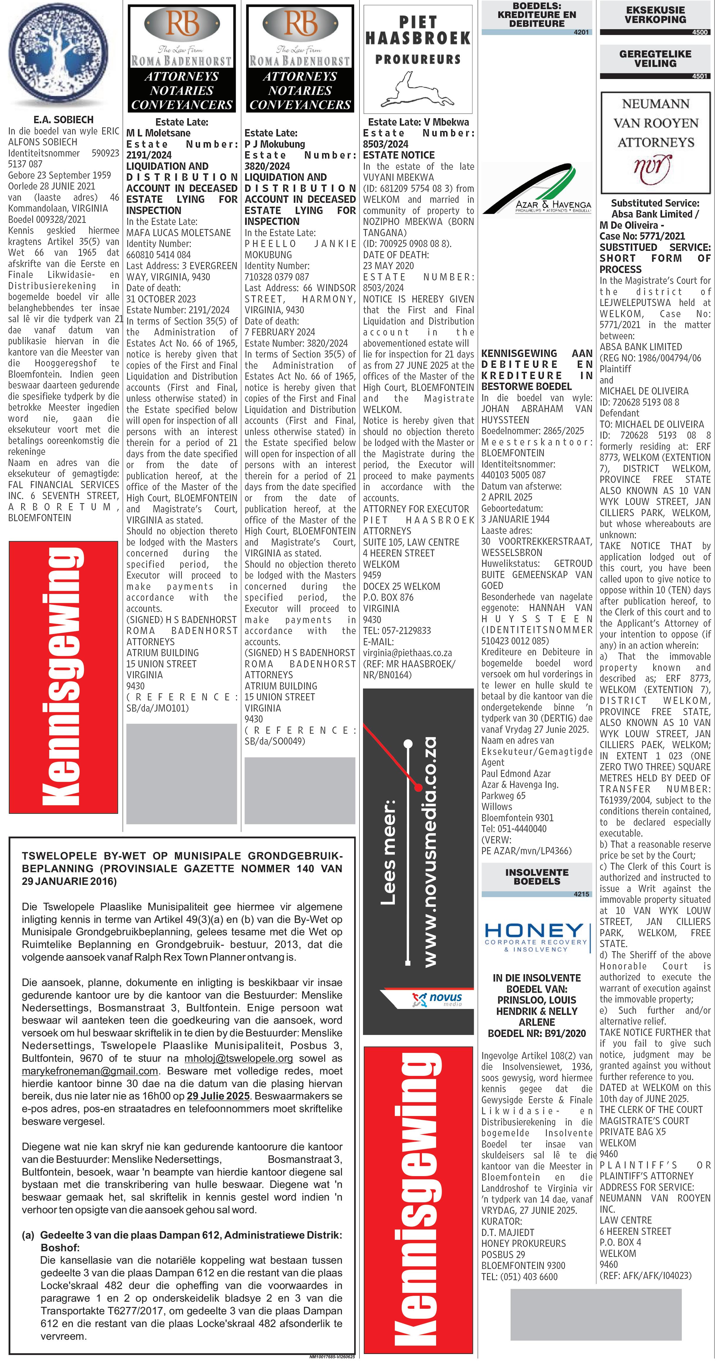 All interested persons having objection to the issue of such copy are hereby required to lodge the same in writing with the Registrar of Deed at FREE STATE within two weeks from the date of publication of this notice Dated at Welkom this 19th day of June 2025.