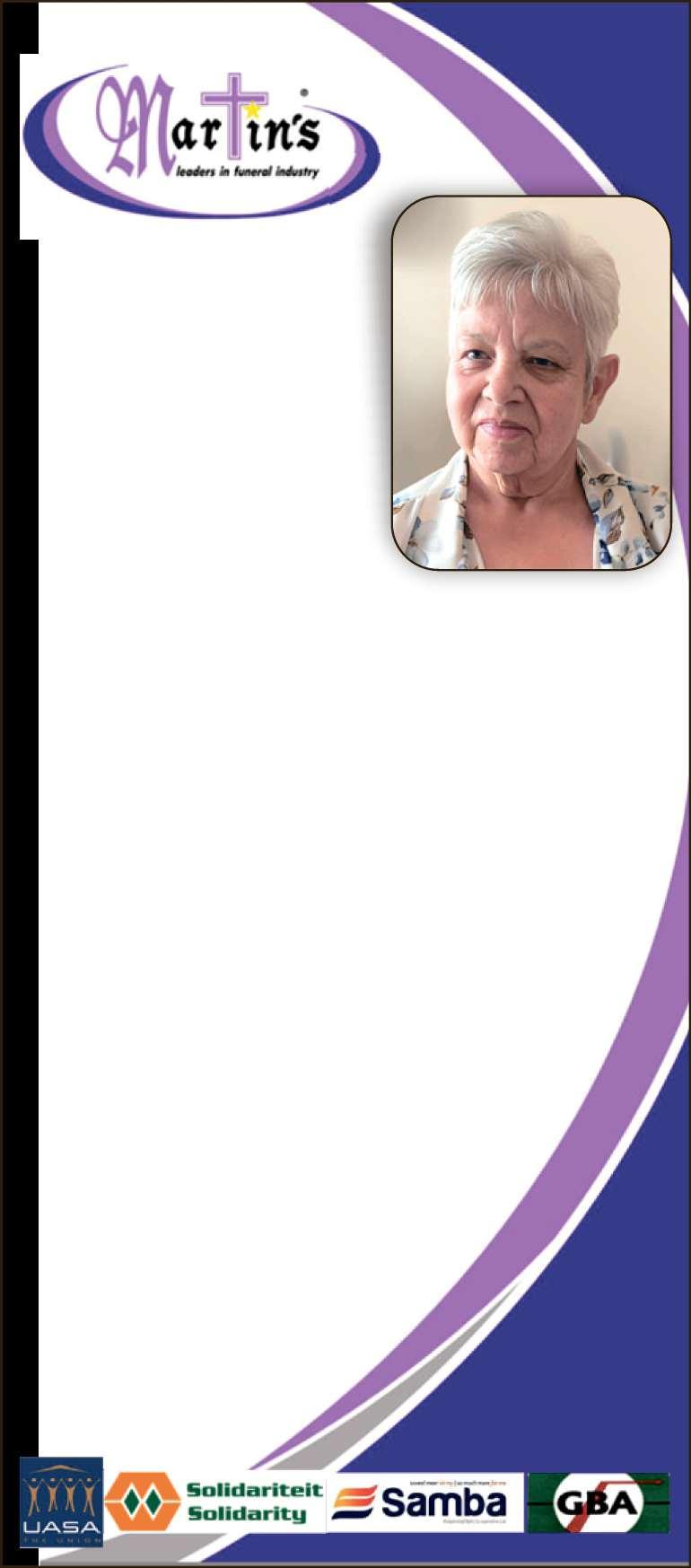 My wife passed away peacefully at home while holding my hand. She wanted our Grandchildren Alma-Lee, EJ and Ezra to know that she loved them dearly and missed them sorely (As do I) Georgie (Gina) and I were married for 52 years and together we served our LORD and SAVIOUR. Our marriage was blessed with two sons Deon and Eric We were privileged to be Foster Parents to Michael, Richard, Jackie, Eddie and Leslie. May she rest in Peace.