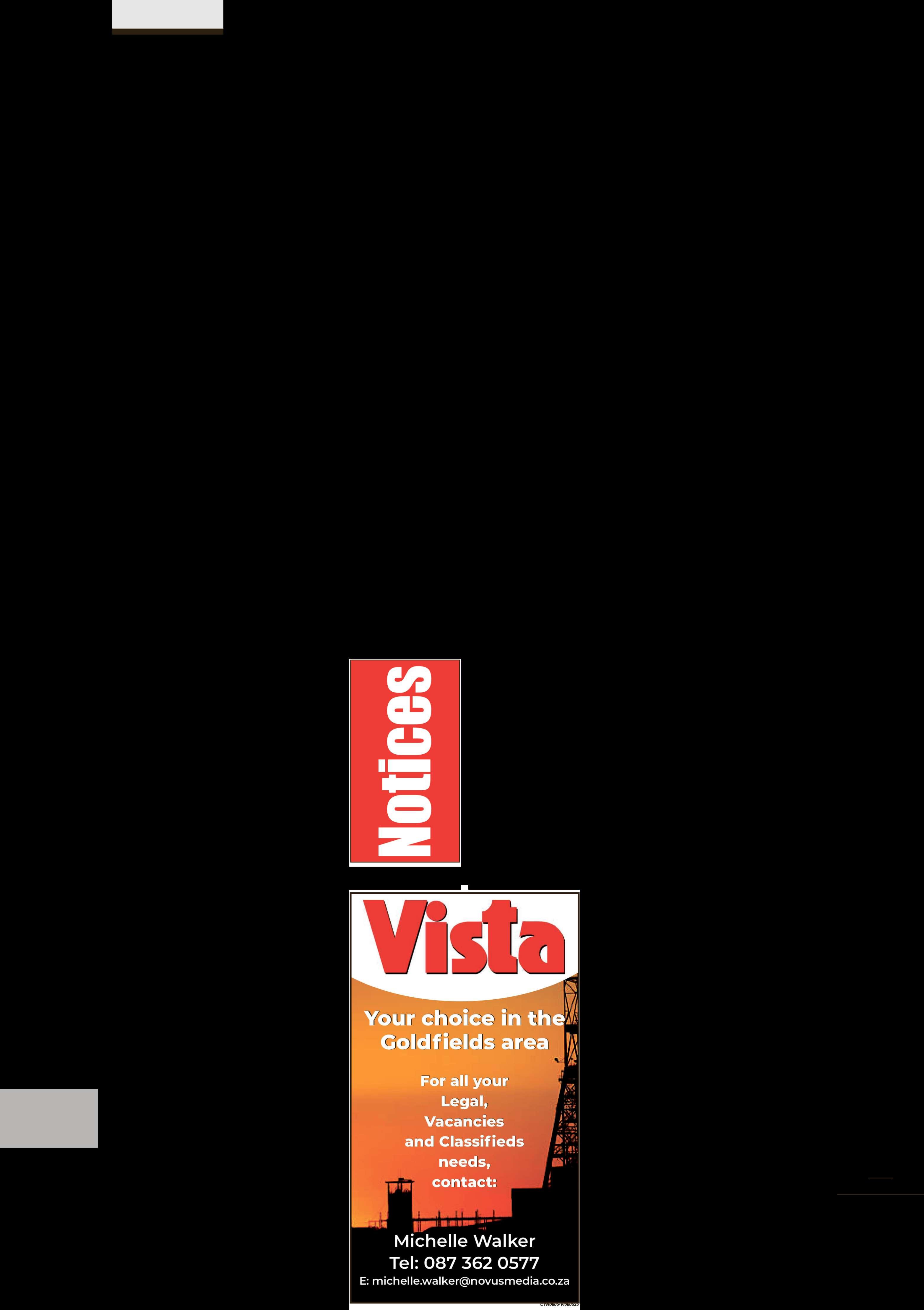 C O E T Z E E , I d e n t i t e i t s n o m m e r : 4210155011084 gebore 15 Oktober 1942, oorlede 19 Januarie 2025, van Plaas Britzpan, Odendaalsrus, Vrystaat. Boedelnommer: 1601/2025. Krediteure en Debiteure in bogenoemde boedel word versoek om hulle vorderinge in te lewer en hulle skuld te betaal by die kantoor van die ondergetekende binne 'n tydperk van dertig (30) dae CORNELISSEN EN VENNOTE (GR) SA 4 TWEEDE STRAAT INDUSTRIA WELKOM 9459