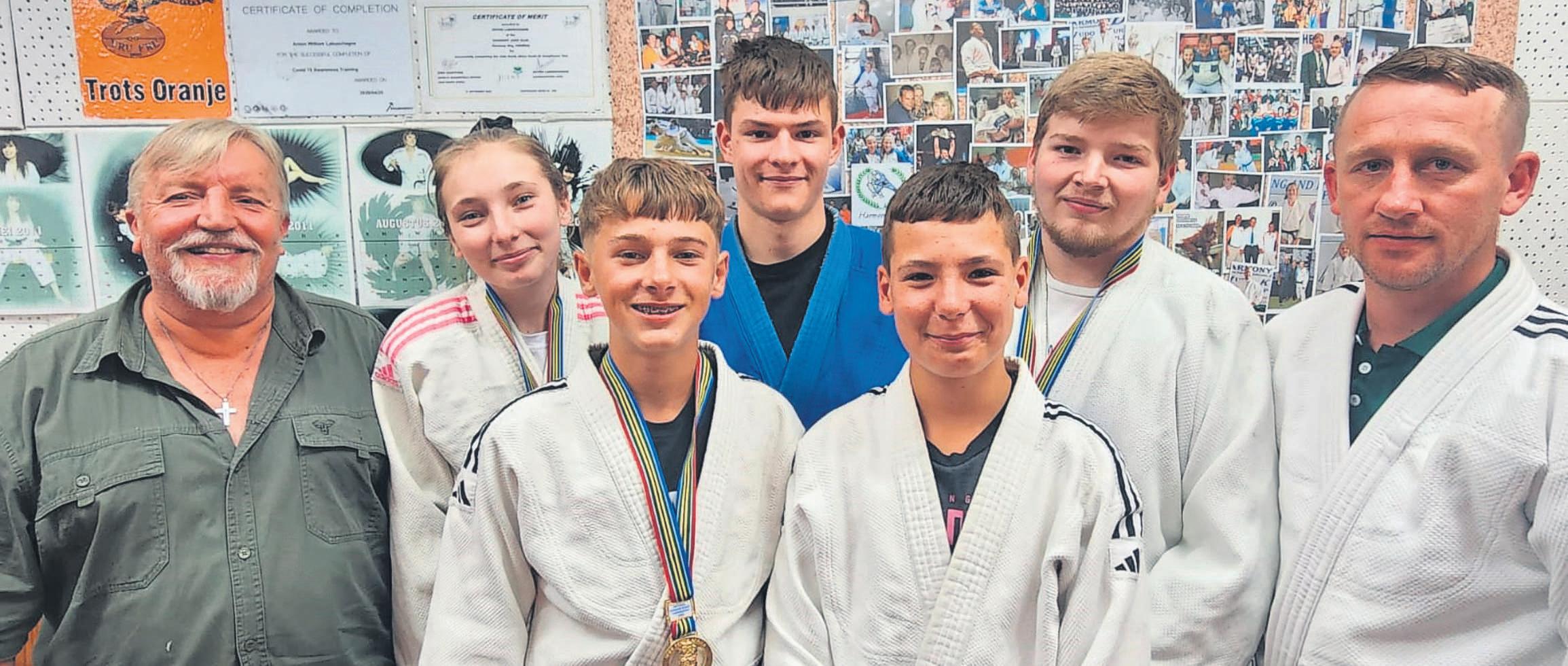 -judoklub het die Lejweleputswa-distrik verteenwoordig op die laaste nasionale yeenkoms vir die jaar,op Saterdag 11 Oktober in Johannesburg.Van links is,voor: ) en Vogan van Zyl (deelname); agter: Anton Labuschagne (hoofafrigter),Alexaneins (vierde),Ruan Labuschagne (brons) en Jaun Pienaar (afrigter) Foto: