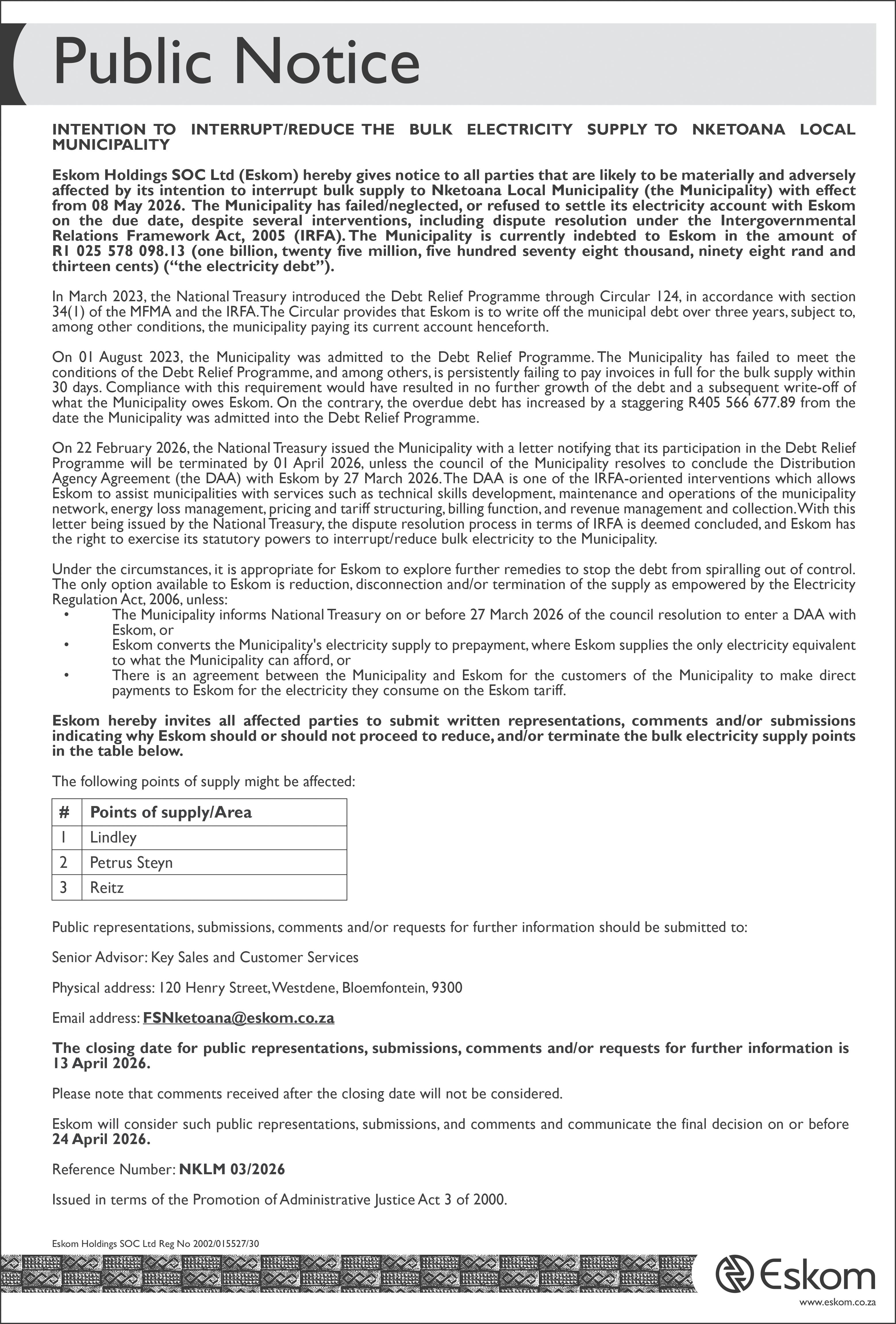 Krediteure en Debiteure in bogemeldeboedel word hiermee versoek om hul rekenings in te dien en hul rekenings te betaal by ondergetekende binne dertigdae gerekenvanaf 13 MAART 2026