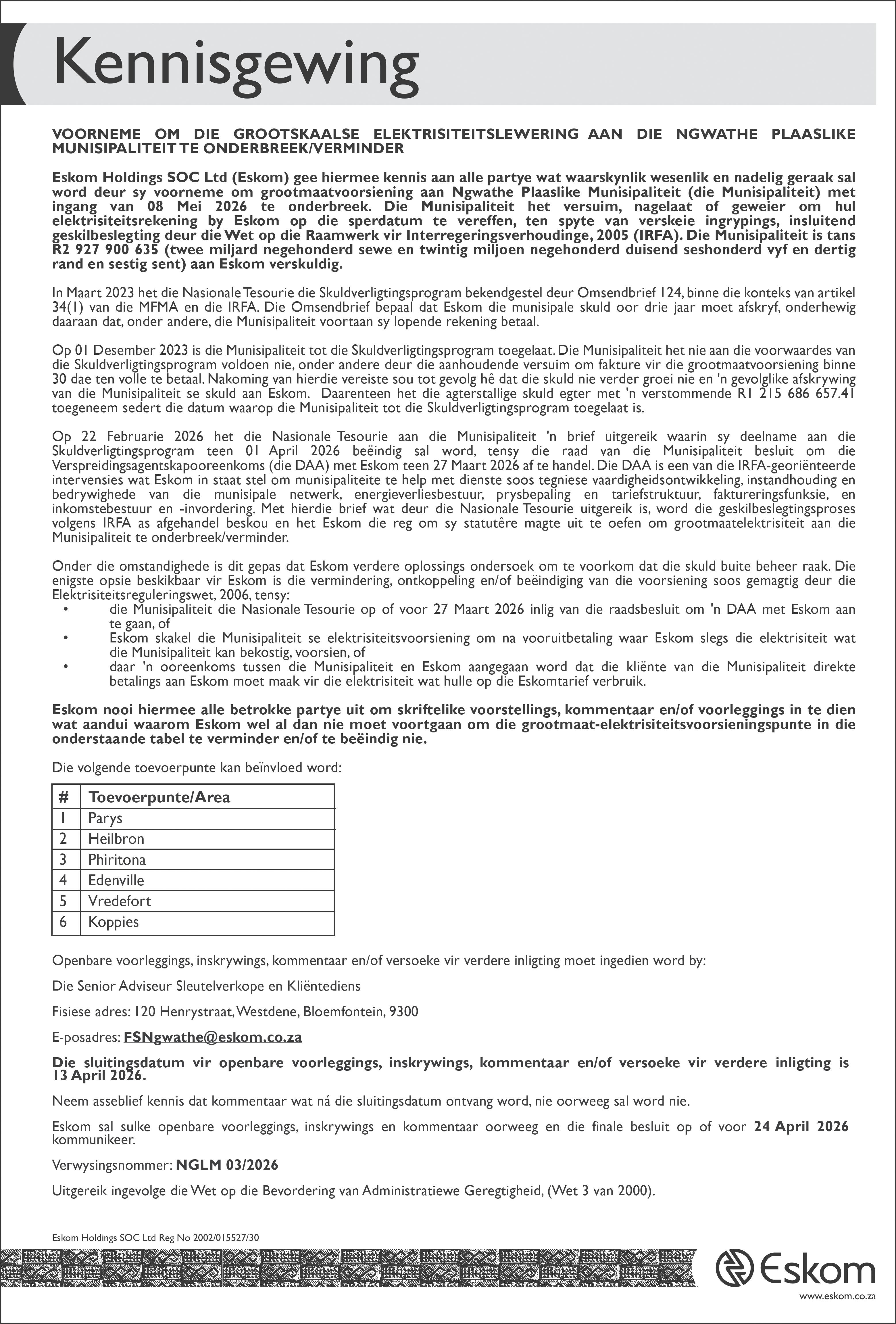 Openbare Deelname Neem kennisdat 'n aansoekingevolge die NasionaleWaterwet, 1998 (Wet Nr. 36 van 1998) ingedien sal word vir magtiging om water te onttrek vi r landboudoeleindes. Ligg ing van wateronttrekking: Plaas: 1380 Verelands Distrik: Fezile Dabi Distrik Munisipaliteit GPSkoördinate van onttrek kin gspu nt : -27.266409, 27.174011 Bela ng heb be nd ee n geaffekteerde partye wat kommentaar of besware het teen die voorgestelde wateronttrekking word versoek om dit binne 60 dae vanaf publikasie van hierdie kennisgewing skriftelik in te dien. Kommentaar of besware kan per e-pos gestuur word na: E-pos: nad ile on ar d1987 @gmail.com