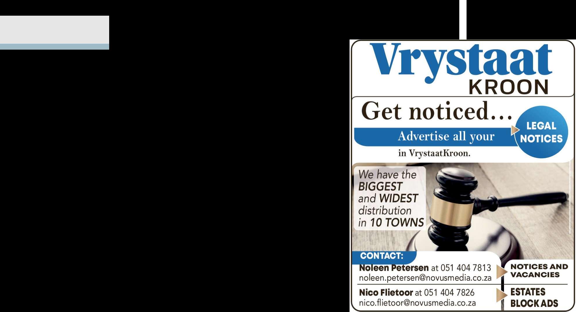 Distribusierekening in bogemelde boedel ter insae sal lê vir 'n periode van een en twintig dae, g e r e k e n v a n a f 5 DESEMBER 2025 te die kantore van die Meester van die Hoë hof te Bloemfontein en die Landdros te Kroonstad. WYNAND JOSEPH BOTHA
