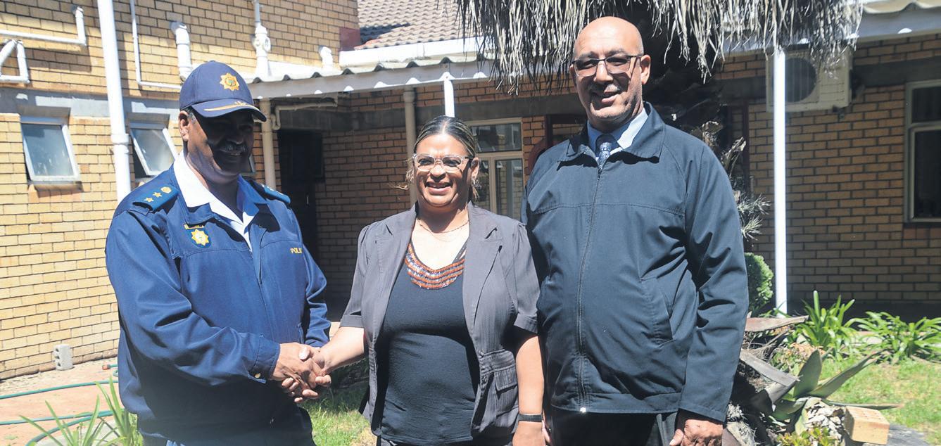 Kol. Mario Thyse verwelkom Kapt. Estelle Farmer terwyl kapt. Rodney Roos, waarnemende speurhoof, toekyk.