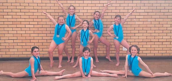 Yzerfontein-gimnaste: Voor is Amber Nel (goud en brons), Arya Smit (goud) en Elnè Nortjè (2 x goud). In die middel: Ava Young (goud en silwer) en Lizette Groenewald (2 x goud). Agter: Lana Dearlove (brons), Leah Taljaard (goud en brons) en Lily Wood (goud).