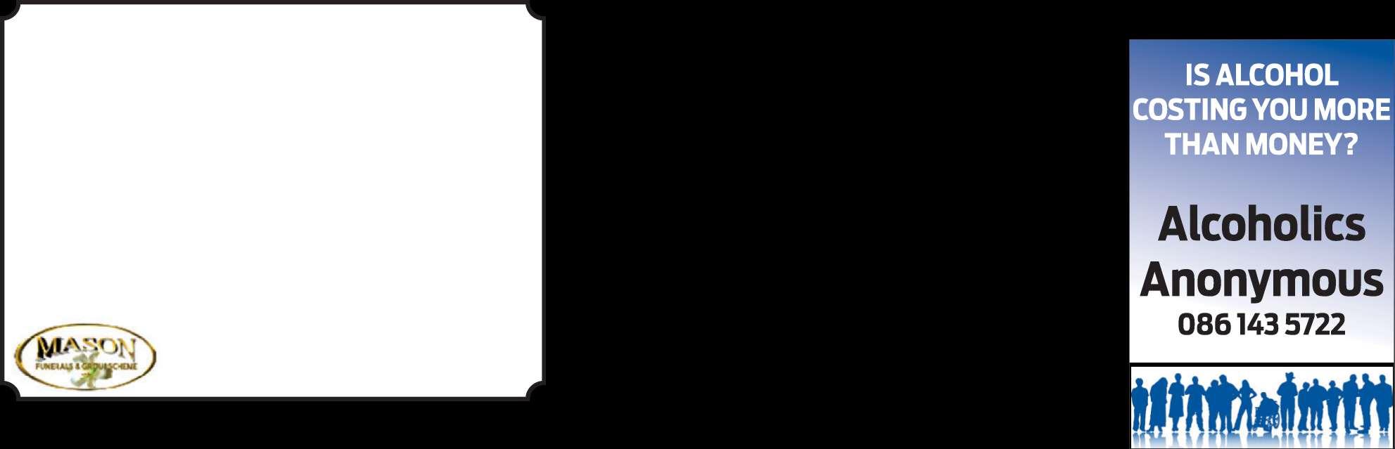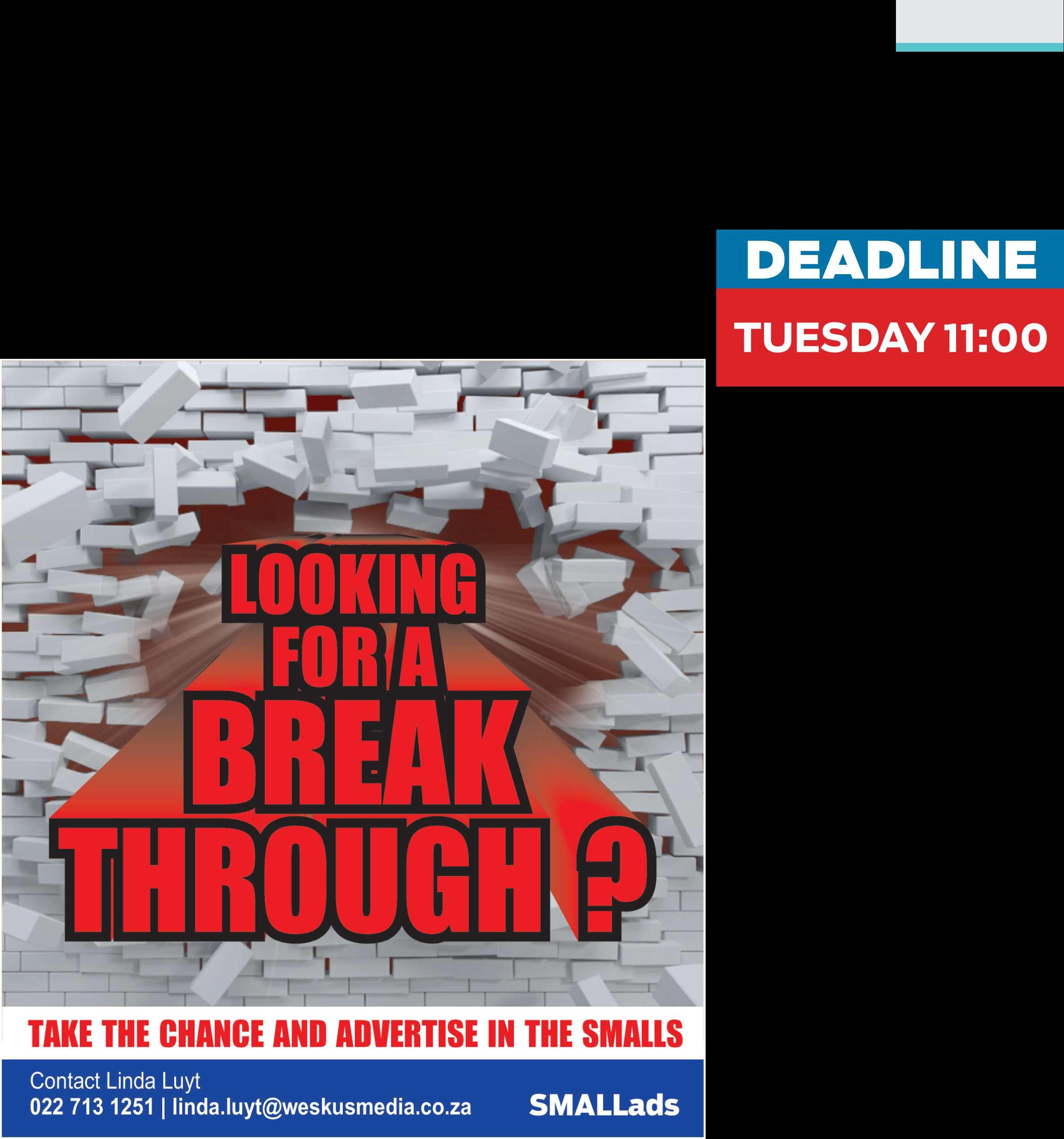 E-pos: weslander@novusmedia.co.za Dagboek-inskrywingsisgratis. Inskrywingsmoet voor 17:00 op ’n Maandagontvang word VRYDAG 13 FEBRUARIE