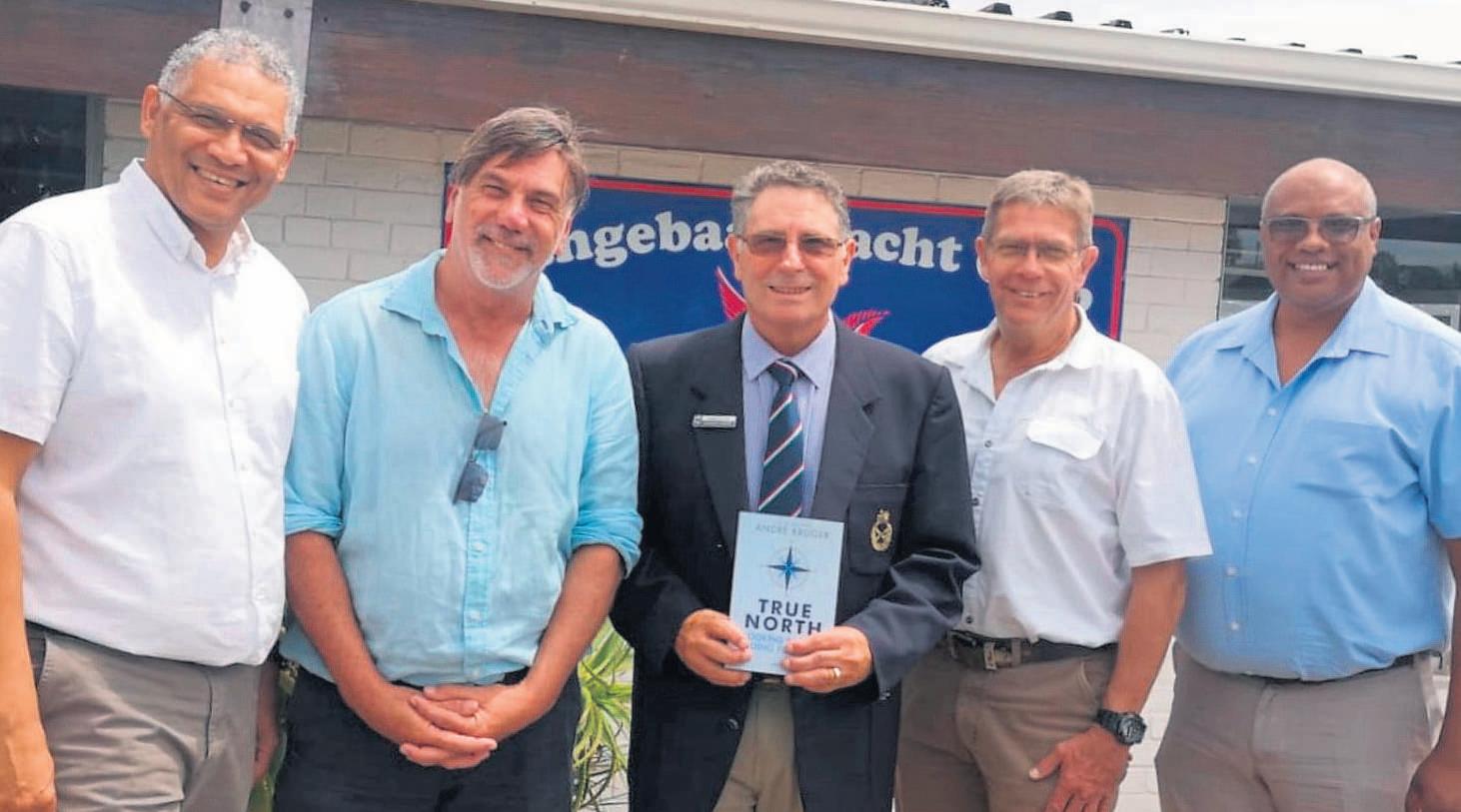 Die bekendstellingsbyeenkoms vanAndréKruger se boek,True North,isdeurverskeie verteenwoordigers vanplaaslikeregeringsbygewoon.Vanlinks is Heinrich Mettler,munisipalebestuurdervan die Saldanhabaai-munisipaliteit (SBM),Marius Koen, oud-burgemeestervan SBM,André Kruger,Boffie Strydom,dieburgemeester vandie Weskus-distriksmunisipaliteit (WKDM) en David Joubert,munisipale bestuurder vandie WKDM.