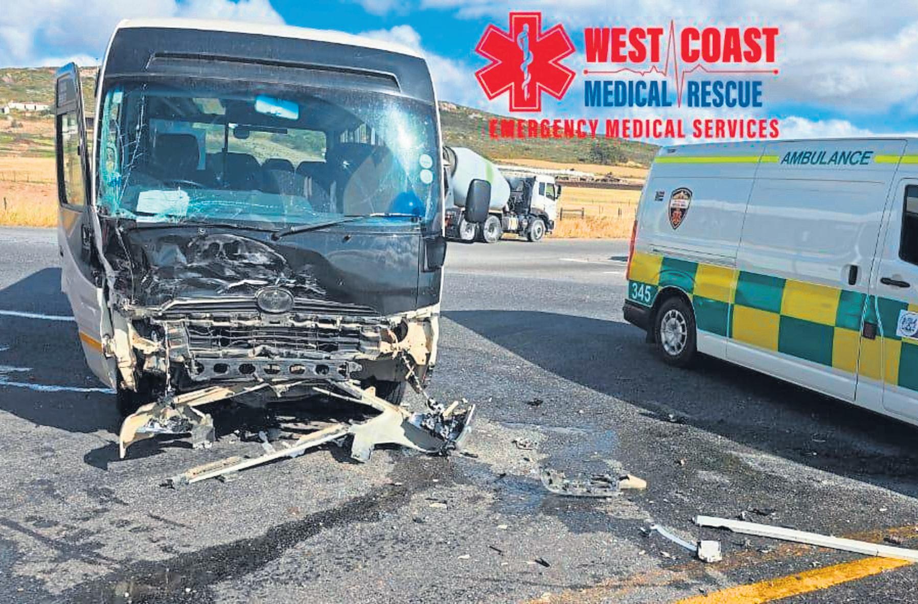’n Botsing het gister (Woensdag 15 Oktober) by die Velddrif-St. Helenabaai-kruising gebeur. West Coast Medical Rescue was op die toneel nadat ’n kleinerige bus en ’n bakkie in die botsing betrokke was. Met hul aankoms is verskeie reisigers vir geringe tot matige beserings behandel. Metro EMS en reddingsdienste saam met Saldanhabaai se brandweer-en-verkeersdienste was binne minute op die toneel om te help. Alle pasiënte is na ’n nabygeleë hospitaal vervoer. West Coast Medical Rescue bedank Metro EMS vir hul bystand op die toneel. Foto: West Coast Medical Rescue