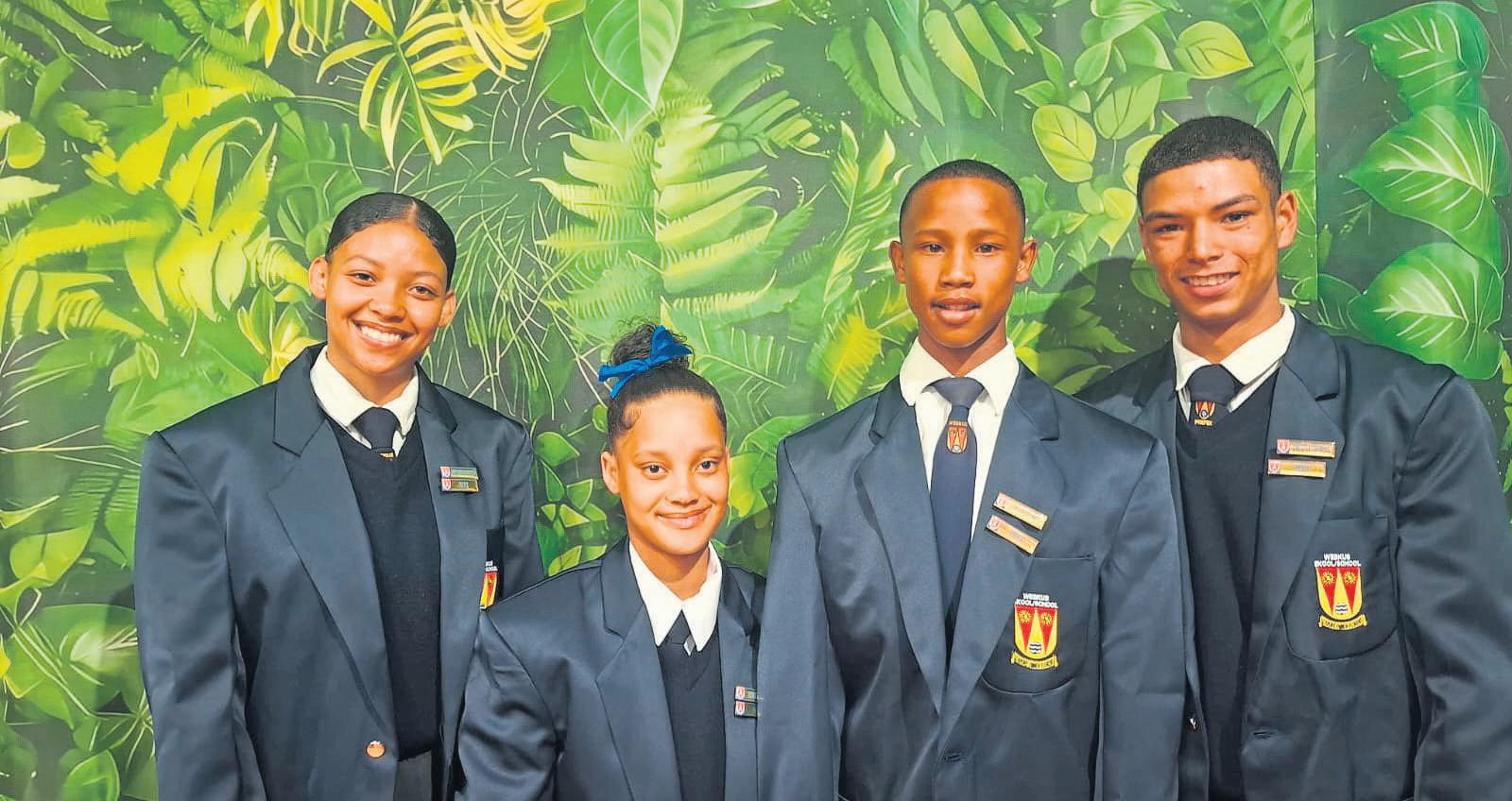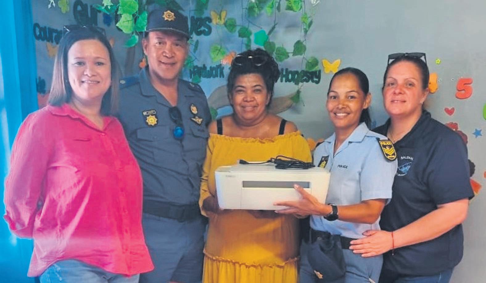 Lt-Col Craig Diedericks of the Saldanha SeaBorder Unit recentlyhanded aprinter overtothe Palm Tree Academy, ledbyprincipal MercyVlok. Thedonation forms part of the unit’scommunity-outreach initiative, aimedatsupporting localschoolsand promoting education. Pictured areWOAndrea Van Rooy,Lt-ColCraig Diedericks, principal Mercia Vlok, SgtMarilizeSwartbooi and WO Leonie du Randt