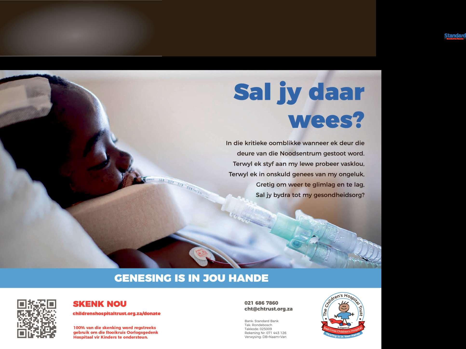 Datdie stille vriend vanons almal –die dood –ons maar oral vergesel, is ’n feit.Hoe somber dit ook al klink, is dit ’n feit watons nie kanwegredeneer nie Hoe die einde vir ons elkeen salengaan aanbreek, is ons ook nie vanseker nie Dit bring ook opnuut daardie pleidooi na ons as volwassenes datons te alle tye en onder alle omstandighede die belange vanons kinders eerstemoet plaas–hetsyons dit in die klaskamer,openbare vervoer,bydie huis of waar ook al moet doen en toepas.Ons kindersishelaasdie toekomstigeleiers vanmôre. Ek het die wonderlikevoorregomdaagliksdie taak as opvoeder uit te oefen.