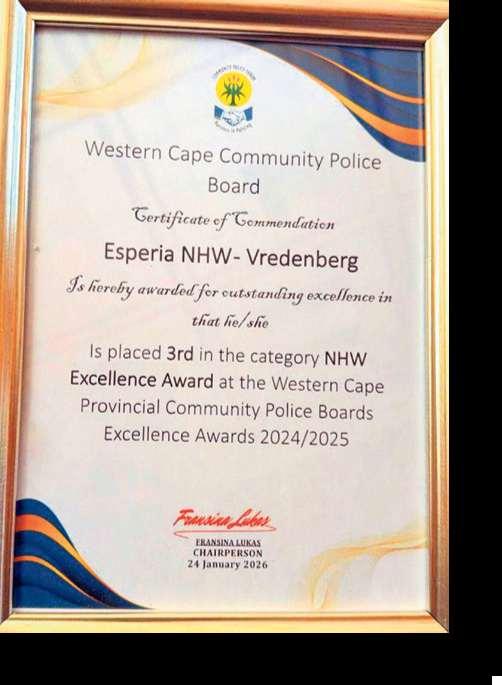Koos Liebenberg,voorsitter van die Yzerfontein-buurtwag, hetdie toekenning en sertifikaat namensdie organisasie ontvang en beklemtoon dat die prestasie te danke is aanharde werk,samewerkingenopofferingvan hul lede, uitvoerende komitee en operasionele spannewat ureop patrollie spandeer