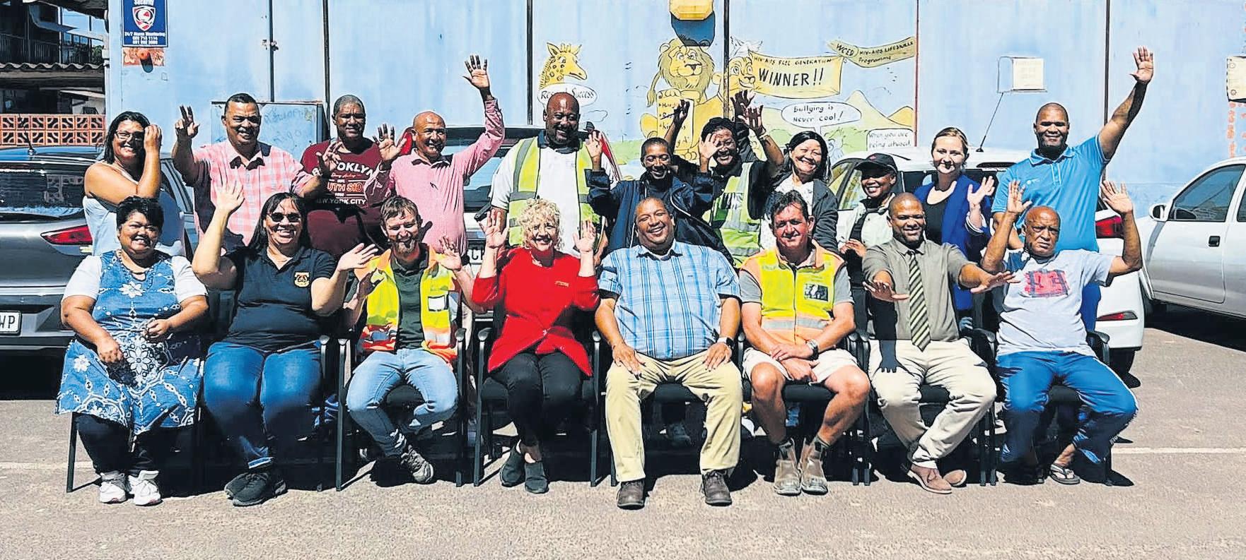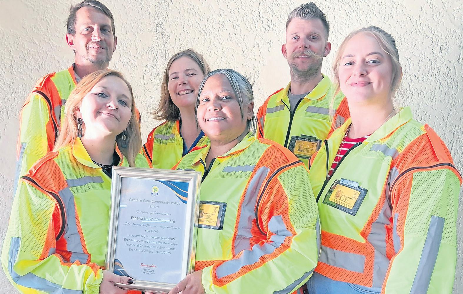 Trots met hulsertifikaat is (voor vanlinks)Carli Smook, woordvoerdervan die Esperia-buurtwag(en sekretaressevan die Vredenburg-GPF), Sheryl Kapot, ondervoorsittervan die Esperia-buurtwag, en Kim Kalsbeek, sekretaresse. Agterstaan Freddie Smook, GPF-voorsitterenstigterslid vandie buurtwag, en die bestuurslede Mariana KotzeenJean-PierreVorster Foto:Alida Buckle