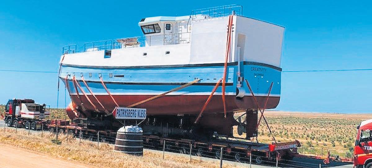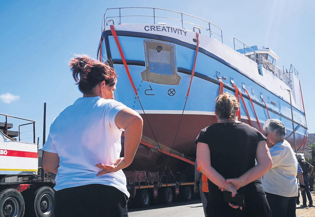 Ná weke se beplanning, spanningen groot openbare belangstelling is die pelagiese vissersboot Creativity eers gistermiddag (Woensdag4 Februarie) te water gelaat en nie vroegoggendsoos aanvanklik beplan is nie. Volgensdie eienaar, Waldie de Wet, sou die 140-ton-vaartuig tussen 16:00 en 17:00 die water tydens gunstige getytoestande binnegaan Creativity hetgisteroggendnog stewigopdie sleephelling in St. Helenabaai se hawegelê, waar finale voorbereidings afgehandel is Weslander volg die boot se merkwaardige reis reeds sedertMaandag 26 Januarie toe sy die eerste keer uitdie SachalskeepswerfinVredenburg gestoot is Creativity is die afgelopeMaandag (2Februarie) padlangs teen ’n slakkepas na die hawe vervoer– ’n logistieke prestasiemet bykans200 wiele, ’n platbak-vragmotorentydelike Eskom-kragonderbrekings metdie roete langs Honderdebelangstellendeshet langs die Vredenburg-Velddrifpad en by die hawe in St.Helenabaaisaamgedrom om diéseldsame gebeurtenis te aanskou. Benewens haar indrukwekkende grootte, is Creativity veral opvallend weens haar gevorderde tegnologie Die boot is volledig plaaslik bydie