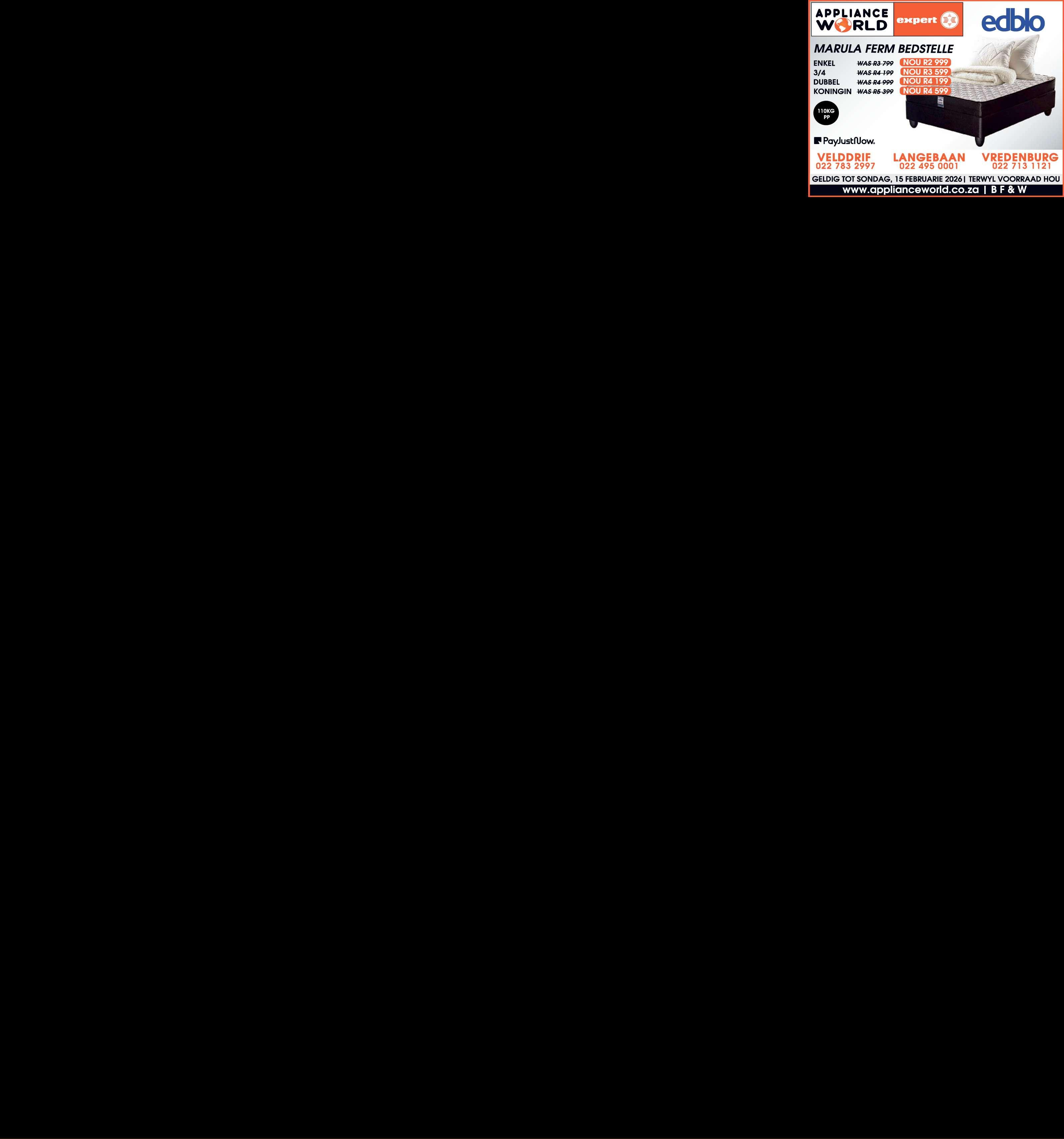 •Hopefield-GPF: Die Hopefield-GPF hou op Maandag 2Maart ’n spesiale vergadering om 19:00 by die Hopefield-Thusong-sentrum. Die imbizo vind plaas op Maandag 9Maart om 19:00.