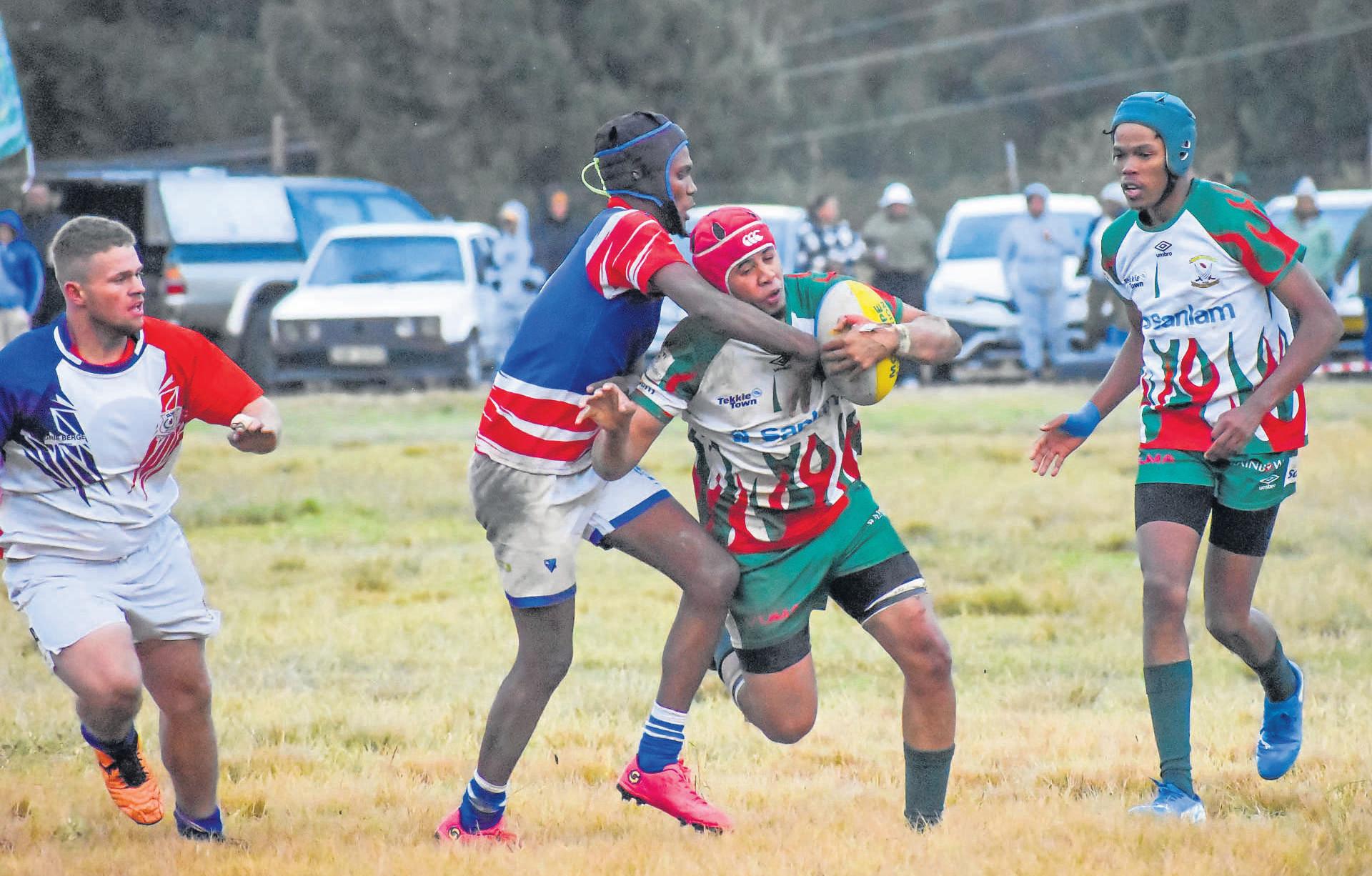 Young Warriors voer botoon in derby teen Young Turbo’s Dawro Kock, die losskakel van Young Warriors, word deur ’n Young Turbo’s-verdediger beetgekry tydens die twee spanne se streekuitdaagbekerstryd Dié stryd, ook bekend as ’n derbykragmeting, is op die Keisie-rugbyveld in die Keisie-vallei gespeel Young Warriors het met 23-19 gewen FOTO: