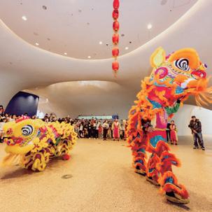 在歌劇院公共空間的龍獅團表演,是華 人文化最受歡迎的喜慶演出之一,高超技 藝總能贏得滿堂彩,相當風光。「舞龍舞 獅不是個人英雄主義的運動,而是一項需 要團隊互助的藝術競技。」巫松軒強調, 演出中經常有突發狀況,鼓手因主辦方需 求下達全新指令,舞獅者必須立即隨機應 變,例如獅子跑跳時若不慎跌倒,如何立 刻轉化為逗趣的「生氣狀」重回軌道, 「有時失誤反而成為亮點,觀眾會笑、會 拍手,因為他們看到的不只是技術,而是 有親和力的人味。」這些臨場與即興,體 現了團員們每日勤於訓練的技藝、肌耐力 與默契,透過每一次的經驗,方能堆疊出 表演的精湛與靈動。