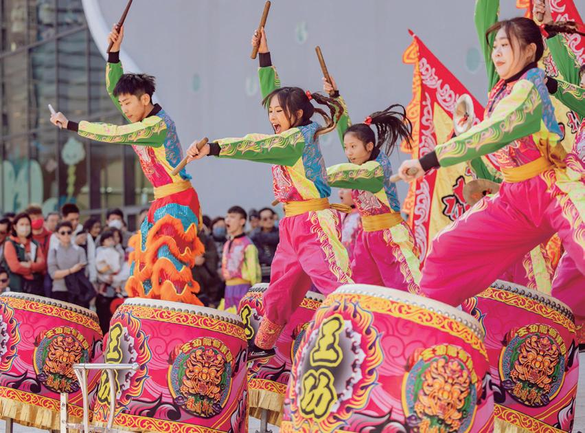 在振奮人心的咚咚鼓聲中,靈活的金獅 翻躍、俏皮地眨眨大眼,舞動出歡騰的新 春氣氛,完全抓住圍觀民眾視線。「能在 國家級場館表演,是我們團員的榮譽,很 開心臺灣龍獅文化被肯定。」王功兩廣國 術龍獅戰鼓團(簡稱龍獅團)團長巫松軒 表示,自 2022 年起與臺中國家歌劇院合 作,2026 年是第 4 度受邀,讓這支成立