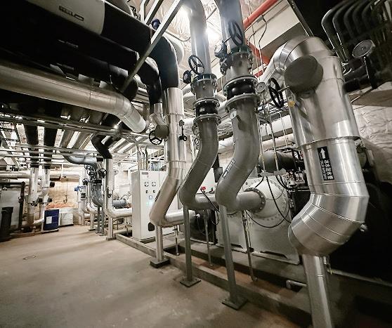(右)磁浮變頻離心式冰水主機,能實現更高效率與更平穩運轉,達到節能效果。