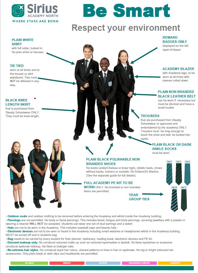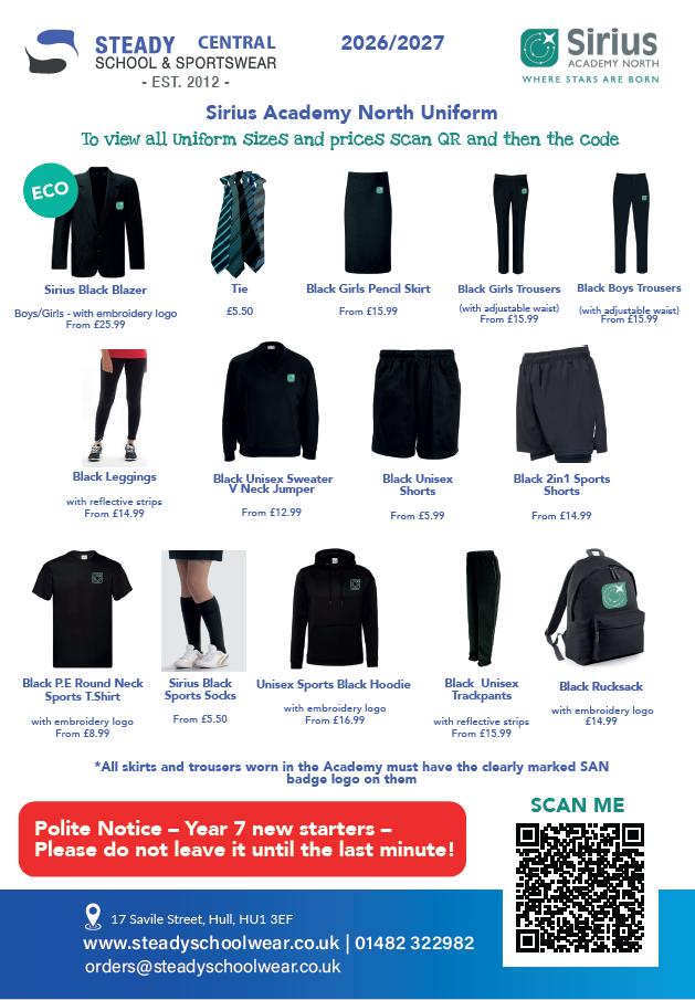 The above items are all compulsory and must be purchased direct from our supplier; Steady Schoolwear, 17 Saville Street, Hull, HU1 3EF There are also optional items to include, Sirius Academy North Jumper, a Sports hoody, Black PE Leggings, Sports Socks and black 2 in 1 shorts.