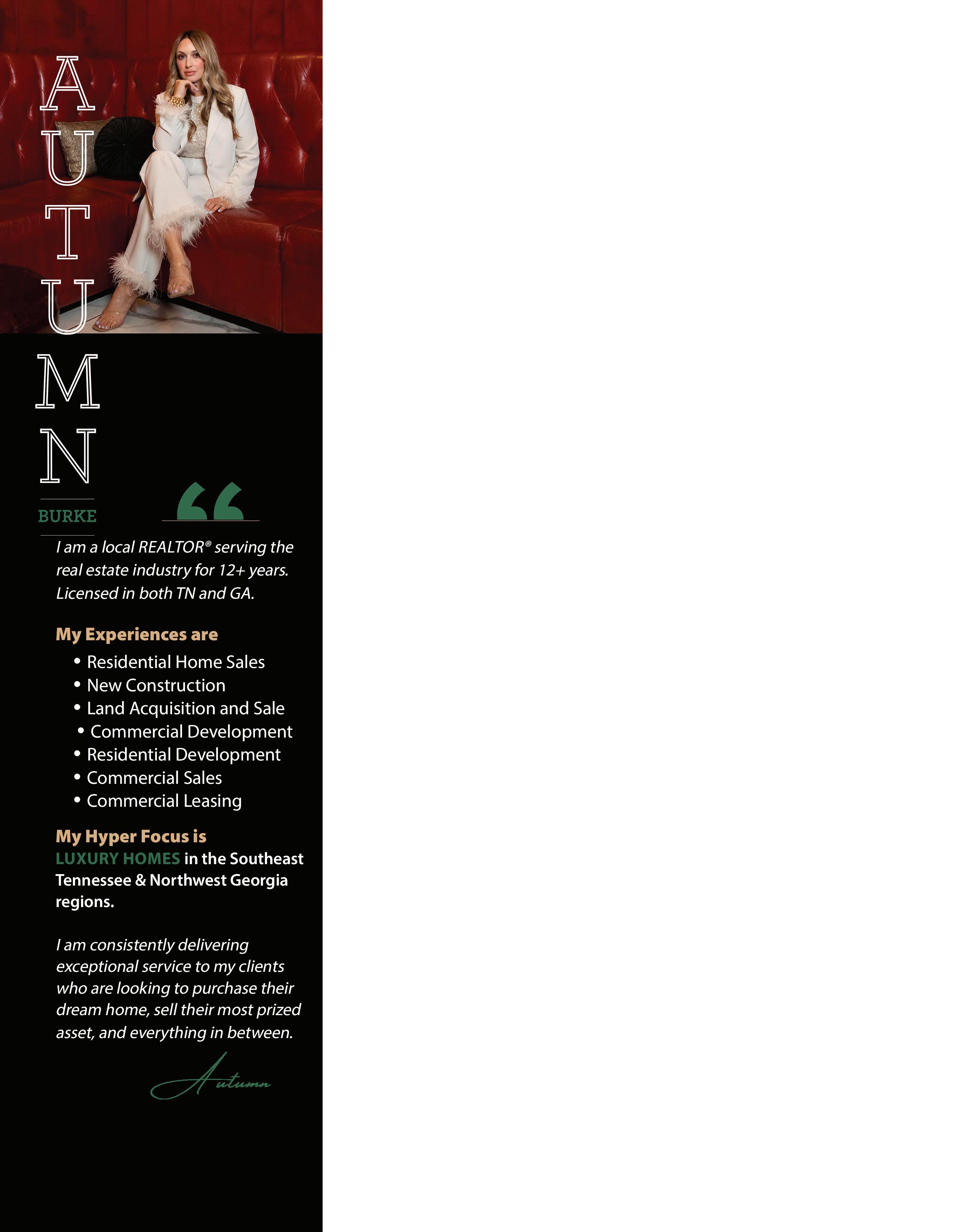 A recognized leader in the luxury market, Cassie is a certified Luxury Collection Specialist and has been featured on the cover of Chattanooga Real Producers Magazine and Top Agent Magazine. She was also honored as a finalist for Chattanooga’s Best of the Best, reflecting the trust and loyalty she has earned from her clients and community alike. Known for her innovative marketing, professional presentation, and strong negotiation skills, Cassie consistently helps her clients achieve top value ... whether they are buying their first home or selling a premier estate.