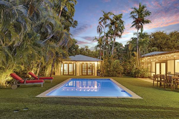 tropical backyard oasis with heated pool, deck and brick patio