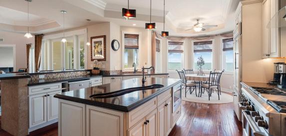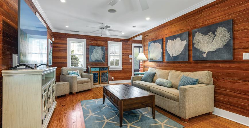 The home’s interior blends comfort and style with tile flooring throughout the first level, and a wood staircase leading to the all-wood master suite upstairs. A spacious kitchen anchors the main living area, boasting abundant cabinetry, and generous counter space—perfect for entertaining or preparing the day’s fresh catch.