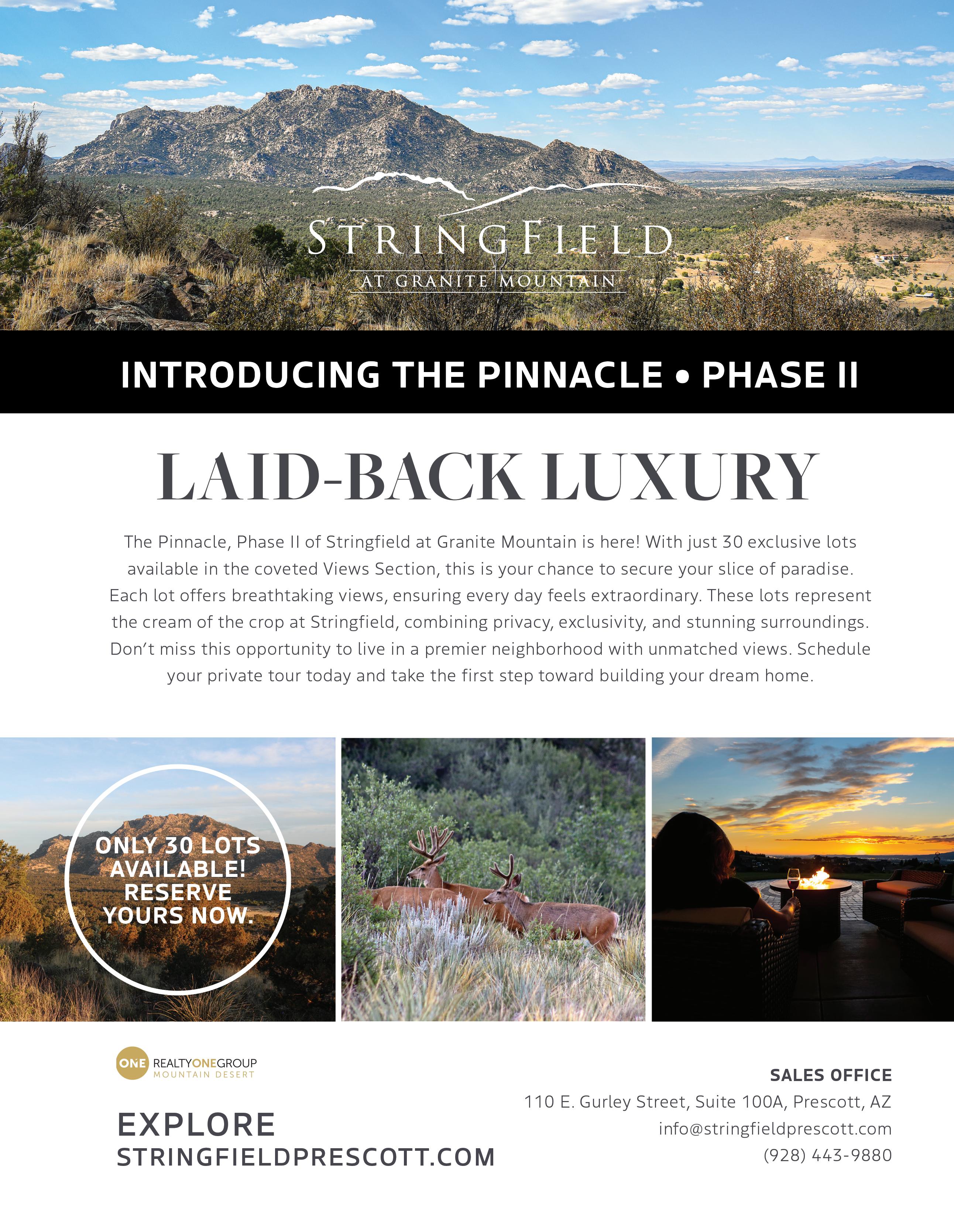 Stringfield at Granite Mountain is now taking contracts for Phase II! This gated community is just minutes from downtown Prescott and offers a variety of spacious and private home sites, ranging from 1-3 acres, all with customizable options. Endless views, access to nature, and ample space from the over 700 acres that comprise Stringfield. Bordered by mountainscapes and National Forest. Visit our showroom at 110 E. Gurley Street in historic downtown Prescott.