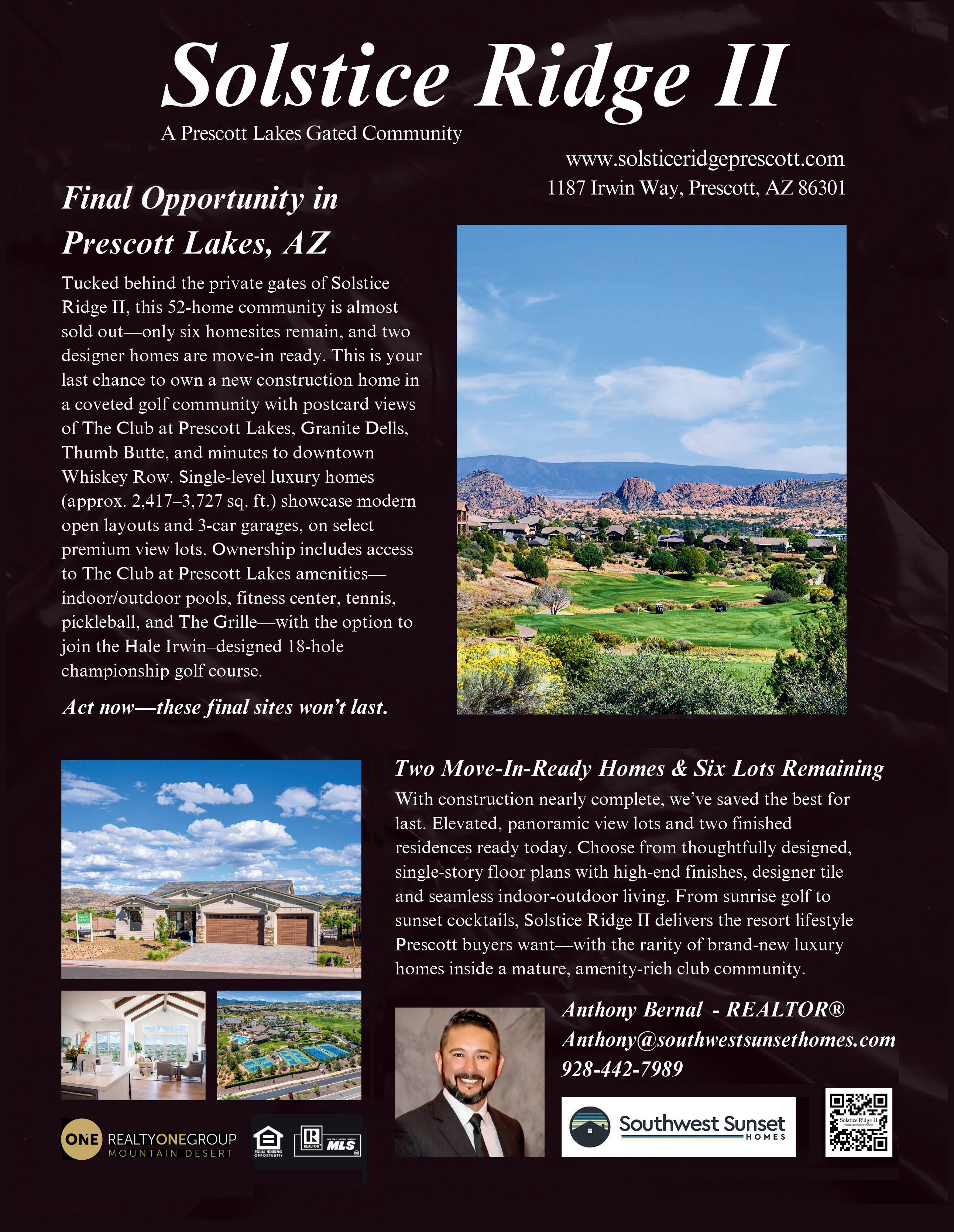 Hassayampa Community Village in Prescott, AZ, is a prestigious gated community celebrated for its luxury living and natural beauty—just minutes from downtown. This exclusive neighborhood offers custom-built homes, townhouses, and condos tucked among towering Ponderosa pines, with dramatic views of the mountains and the Capital Canyon Club. Residents can enjoy optional social or golf memberships at Capital Canyon Club, featuring a Tom Weiskopf-designed course featuring breathtaking mountain and city vistas. Elena Sanwick | 928-710-0993 Elena@LuxuryPrescott.com | www.LuxuryPrescott.com