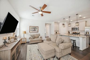 Welcome to effortless elegance in this beautifully crafted one-story Westin Home in the coveted, The Woodlands Hills. This Larson Floorplan with custom built-ins blends comfort, style, and functionality with 4 bedrooms, 3 full baths, a spacious family room, informal dining, and a private study. The gourmet island kitchen opens to the living area with sleek finishes and ample storage. Enjoy a luxurious primary suite with dual walk-in closets and spa-inspired bath, plus a covered patio and 3-car tandem garage with custom cabinetry.