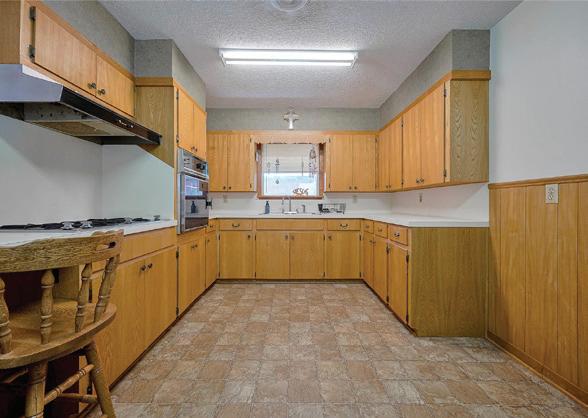 Stainless sink. Tiled family room has cathedral ceiling, wood-burning fireplace overlooking back yard.