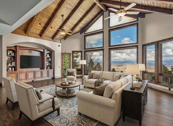 Surrounded by mature trees, this custom residence offers sweeping valley views and dramatic scenery, creating a setting defined by peace, privacy, and natural beauty. This thoughtfully designed living space evokes a sense of retreat. EZ-care landscaping allow the grounds to remain beautiful with minimal maintenance. A beamed entry finished in rock and stucco introduces the spacious layout featuring a dedicated library or office with wood-burning fireplace. The chef’s kitchen is designed with upgraded appliances and center island. The living and dining rooms are generous and inviting, each featuring gas fireplaces. A living room surround sound system, built-in whole-house audio, and optional video camera monitoring add modern comfort throughout. An elevated viewing deck extends the living space outdoors, offering expansive valley and mountain vistas. The primary suite is a private sanctuary, featuring a sitting area, double-sided gas fireplace, and two walk-in closets. The finished lower level offers versatility and can easily serve as secondary living space with a private bedroom, full bath, large bonus area, and patio. Offers a 5- to 6-car garage with sound system, large workshop, and workbench, along with rear patio equipped with gas BBQ hookup. Offered at $3,139,000