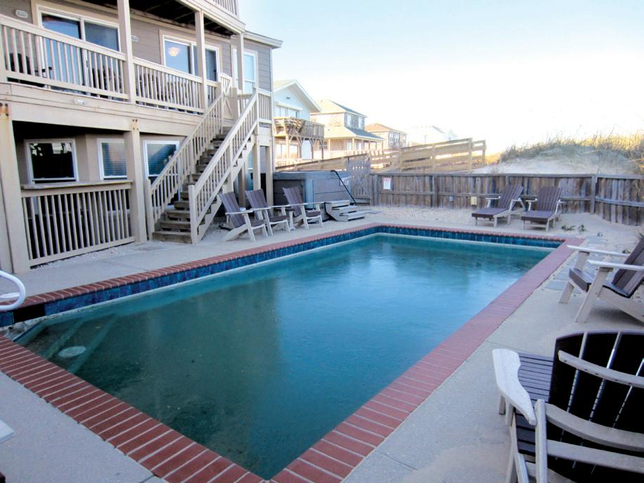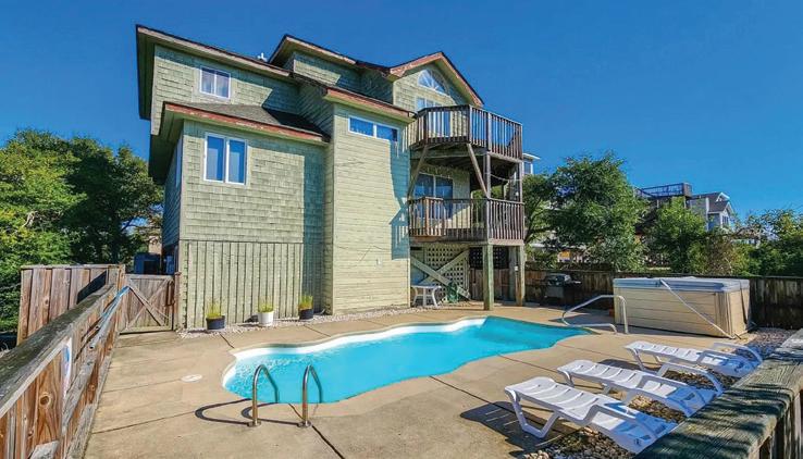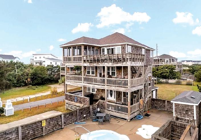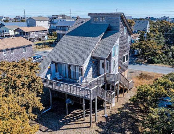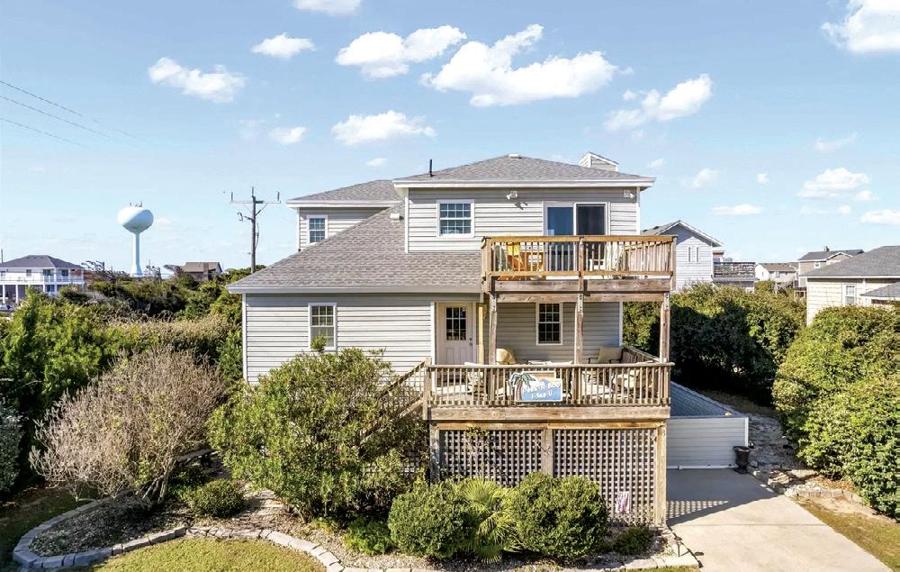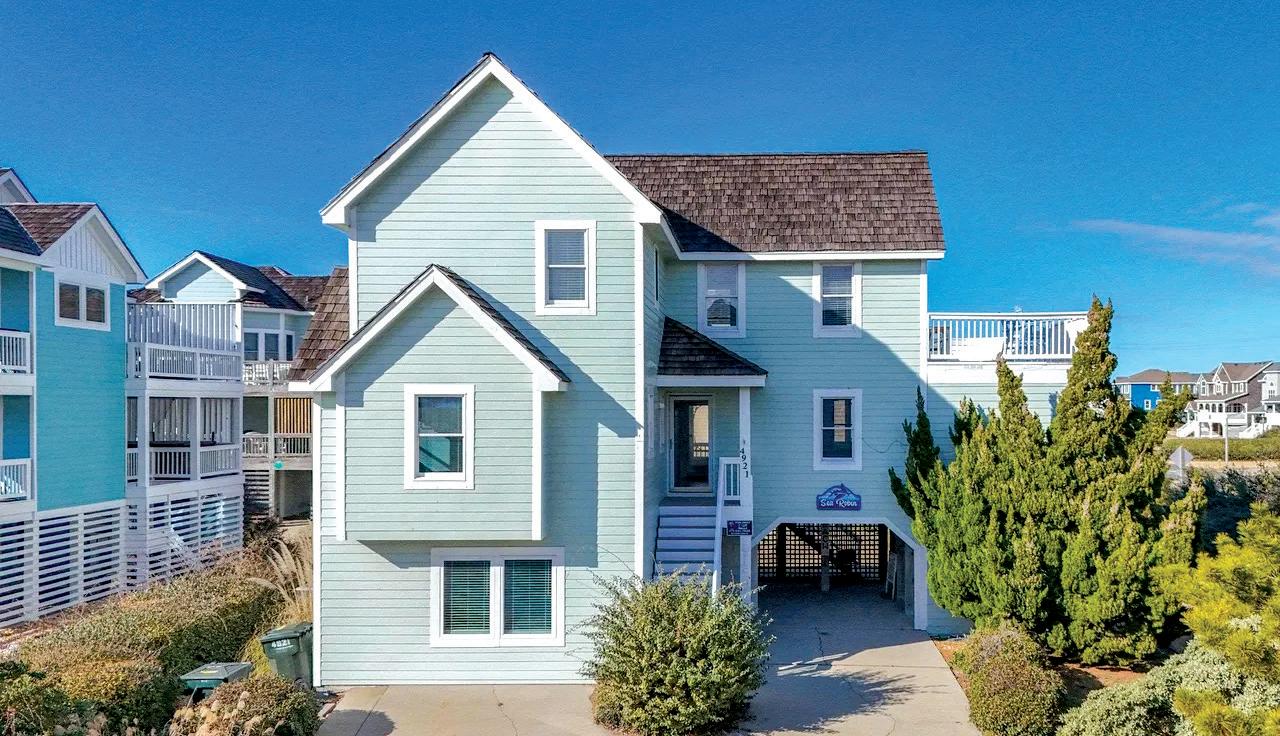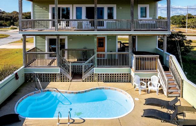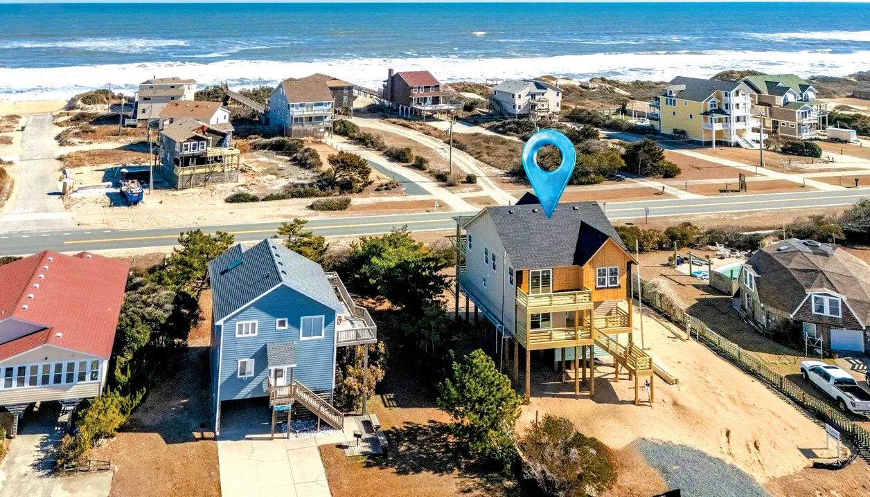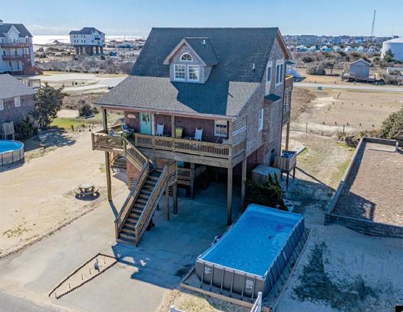 This beautifully maintained South Nags Head retreat offers 5 bedrooms, ocean views, a saltwater pool, easy beach access, and a prime location near top attractions. The reverse floor plan features four bedrooms on the second level, including a private primary suite with ensuite bath and covered deck access. Upstairs, enjoy stunning views from the open living, dining, and kitchen areas with decks on both sides. Outdoor highlights include a pool, hot tub hookups, kayak storage, outdoor shower, and a spacious corner lot perfect for coastal living.
