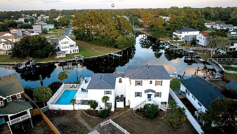 This well-appointed reverse floor plan home captures both golf course and ocean views, offering 5 bedrooms, 4.5 bathrooms, a game room, private pool, hot tub, and screened porch. The upper level features an open living, dining, and kitchen area with a gas fireplace, built-ins, and access to a sun deck overlooking the pool and fairway. The 2023-updated kitchen includes new appliances, custom cabinetry, and pantry. The primary suite offers a walkin closet and spa-style bath. Four additional bedrooms, Jack-and-Jill baths, wet bar, garage, and inviting outdoor spaces complete this coastal retreat.