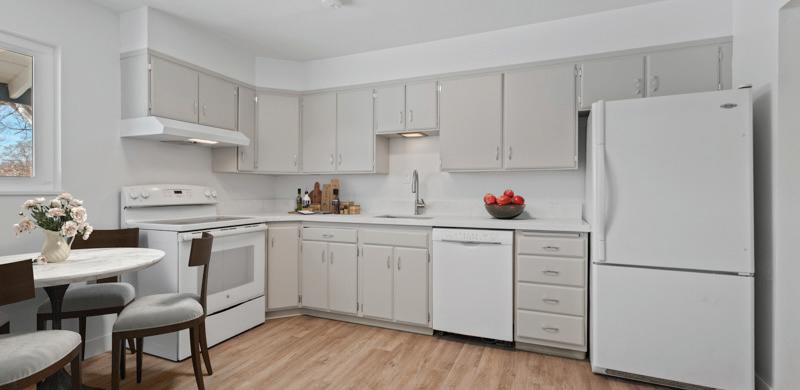 with natural light from an oversized window. Kitchen has extended upper