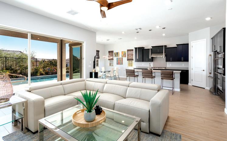 — $725,000 — 4-bedroom, 2.5-bath, 2,447 SF. The expansive great room connects to the outdoors through a dramatic sliding glass wall, creating the perfect setting for entertaining or everyday living. The chef’s kitchen impresses with an island, quartz countertops, S/S appliances, gas cooktop, wall ovens, & white cabinetry with glass accents. The split floor plan features two bedrooms & a full bath, while the primary retreat offers luxurious bath with dual sinks, quartz counters, & a walk-in closet. The den with Murphy bed provides the perfect flex space. Step outside to your personal oasis with a sparkling play pool, artificial turf, dog run, & RV gate. Soaring 10’ ceilings, stylish finishes, & upgrades throughout complete this exceptional residence.
