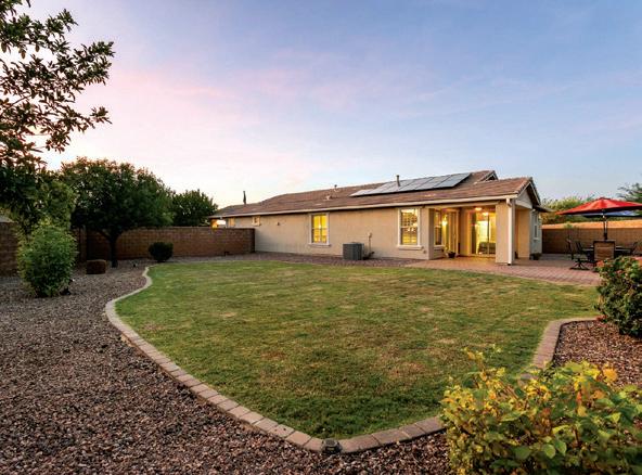 Immaculate single-level home. This 3 bedroom plus flex room, 2 bath home features granite counters, stainless appliances, plantation shutters, updated bath fixtures, and flush mounted speakers for entertainment. Fully owned solar system. Extended length garage with storage. The beautifully landscaped yard offers expansive patio with pavers, large grass area, and home even has rain gutters. Eastmark community offers a pool, playground, biking/walking paths, and clubhouse. $509,000