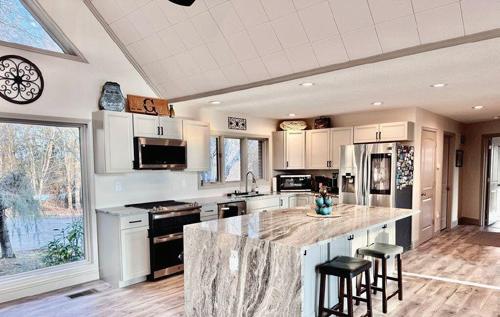 The Ultimate Vol Navy Setup: • Waterfront: 173' of shoreline + Covered dock with boat lift • Multi generational: 3 SEPARATE living quarters (Main house, finished basement,+ guest house!) Septic rated for 3BRs but many flexrooms to suite any needs you have. From the floor-to-ceiling stone fireplace to the spa-quality master suite, this home is ready for summer.