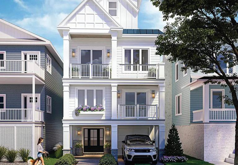 New construction townhomes in historic Lower Chelsea, steps to the beach and Boardwalk, featuring open layouts, gourmet kitchens, private decks, smart-home features, and a 5-year tax abatement. Property A right, B Left.