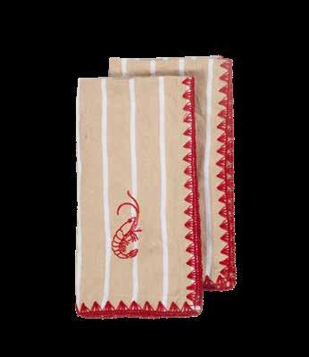 Bubba textiles brings to mind the charm of Southern Europe and long, inviting dinners. With classic beige and white stripes, a stitched edge with a red contrast, and an embroidered shrimp for a playful touch, this textile collection adds a charming element to any table. Pair the table cloth with napkins and tea towels for a cohesive and elegant setting. Made from 70% recycled cotton and 30% recycled polyester. Comes with a ribbon and bow. Designed by Byon Studio.