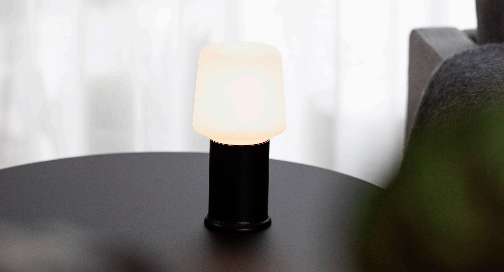 Lamp Intelligent: H11,6 x Ø9 cm, 2600mAh, 120 Lumen, 2700K, IP67 waterproof, Battery life 14 hours at 80%, more than 24 hours at 50%. London Base: H35 x Ø16,4 cm, Powder-coasted stainless steel and opal glass. ERHVERVSPRIS 1 120,00 DKK | VEJL. 2 996,00 DKK