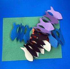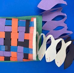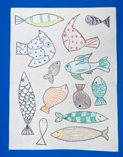Level up: Create a fish chain. Fold a 3-inch wide paper strip back and forth in a zigzag fashion. On the top fold, draw the shape of a fish. The sides of the fish should touch both folded edges. The head and fin should touch each of the cut ends. Cut out the fish shape and open up your chain to see the connected fish. You can tape fish chains together to have a neverending supply of fish!