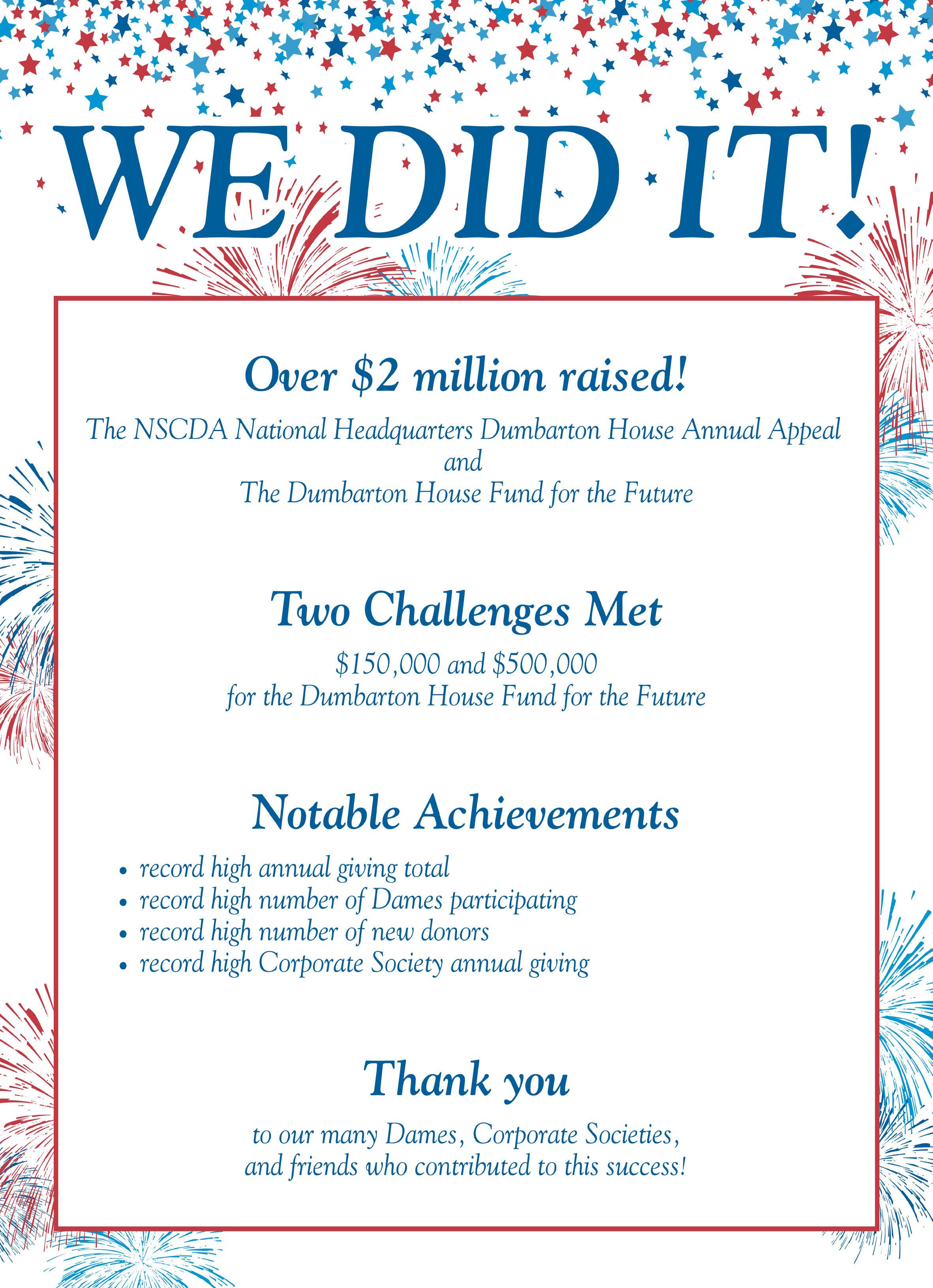 The NSCDA National Headquarters Dumbarton House Annual Appeal is a vital source of funding for comprehensive operations and missioncritical initiatives.