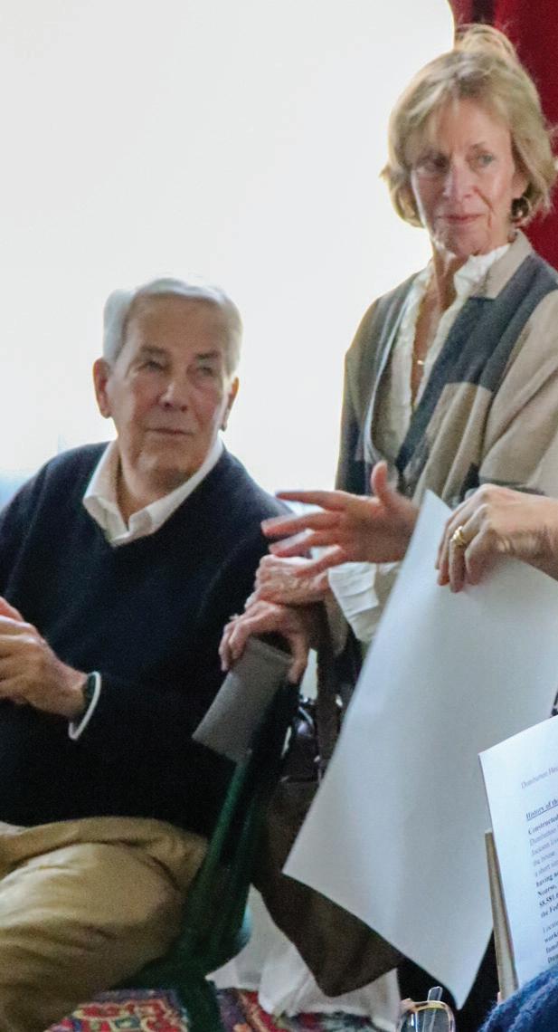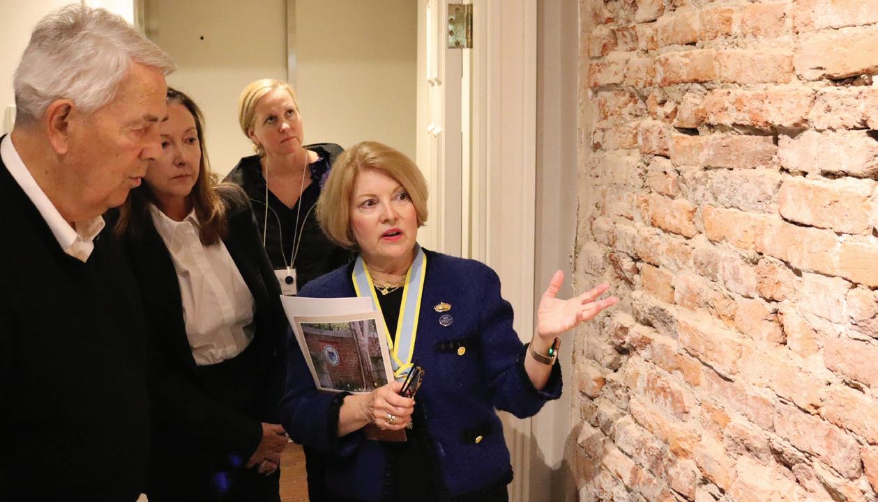 The NSCDA Award for Preserving History's Future 2022 recipient Charles Duell visiting Dumbarton House with his wife Sallie. Artist Peter Waddell and historian Sarah Bahleda met recently with Charles Duell, Henry Middleton’s descendant, to discuss the furnishings Henry and Mary Middleton brought from their South Carolina plantation to Dumbarton House. CLOCKWISE: Anna Duff in conversation with Sallie Duell; Charles Duell is greeted by Carol Cadou; Charles Duell and Genevieve Brown view “Making DC,” an exhibit that tells the story of the (third) capital of the United States; Charles Duell, Genevieve Brown, Holly Hunt and Anna Duff examine the recently uncovered original wall of Dumbarton House; Charles and Sallie Duell in the dining room.